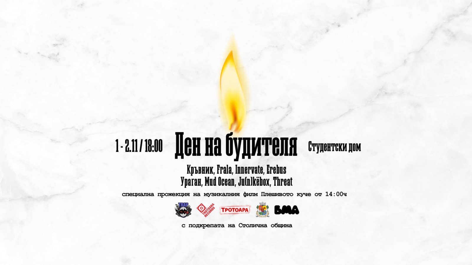 На 1 и 2 ноември от 18.00 ч. в Националния студентски дом Българската музикална асоциация представя събитие от проекта "Сцена – нова музика", посветено на Деня на народните будители. На една сцена се събират някои от най-активните млади групи от българската независима сцена – "Kръвник", Frala, Innervate, Erebus, Zadek, Mud Ocean, Ju(n)këbox и Threat, а специален акцент в програмата ще бъде прожекцията на музикалния филм "Плешивото куче". Входът е свободен.