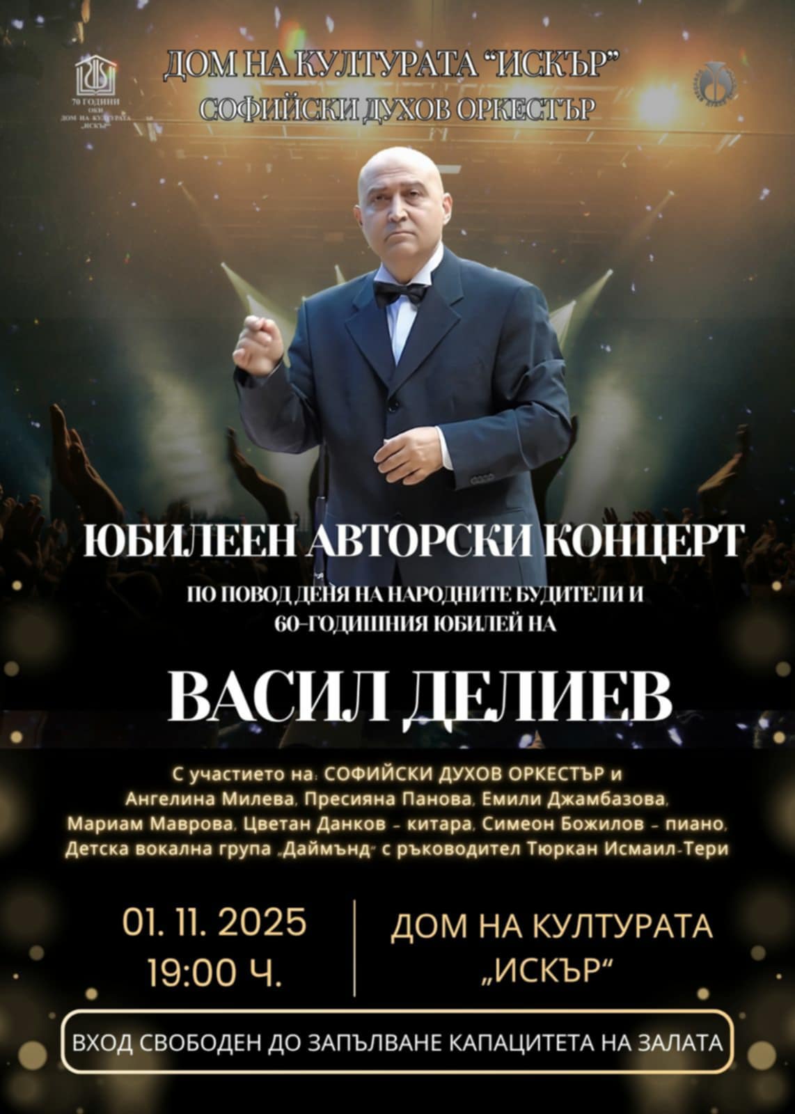 На 1 ноември (събота) от 19.00 ч. в Общински културен институт Дом на културата "Искър" ще се проведе Юбилеен авторски концерт на маестро Васил Делиев, посветен на неговата 60-годишнина и на Деня на народните будители. Входът е свободен до запълване на капацитета на залата.