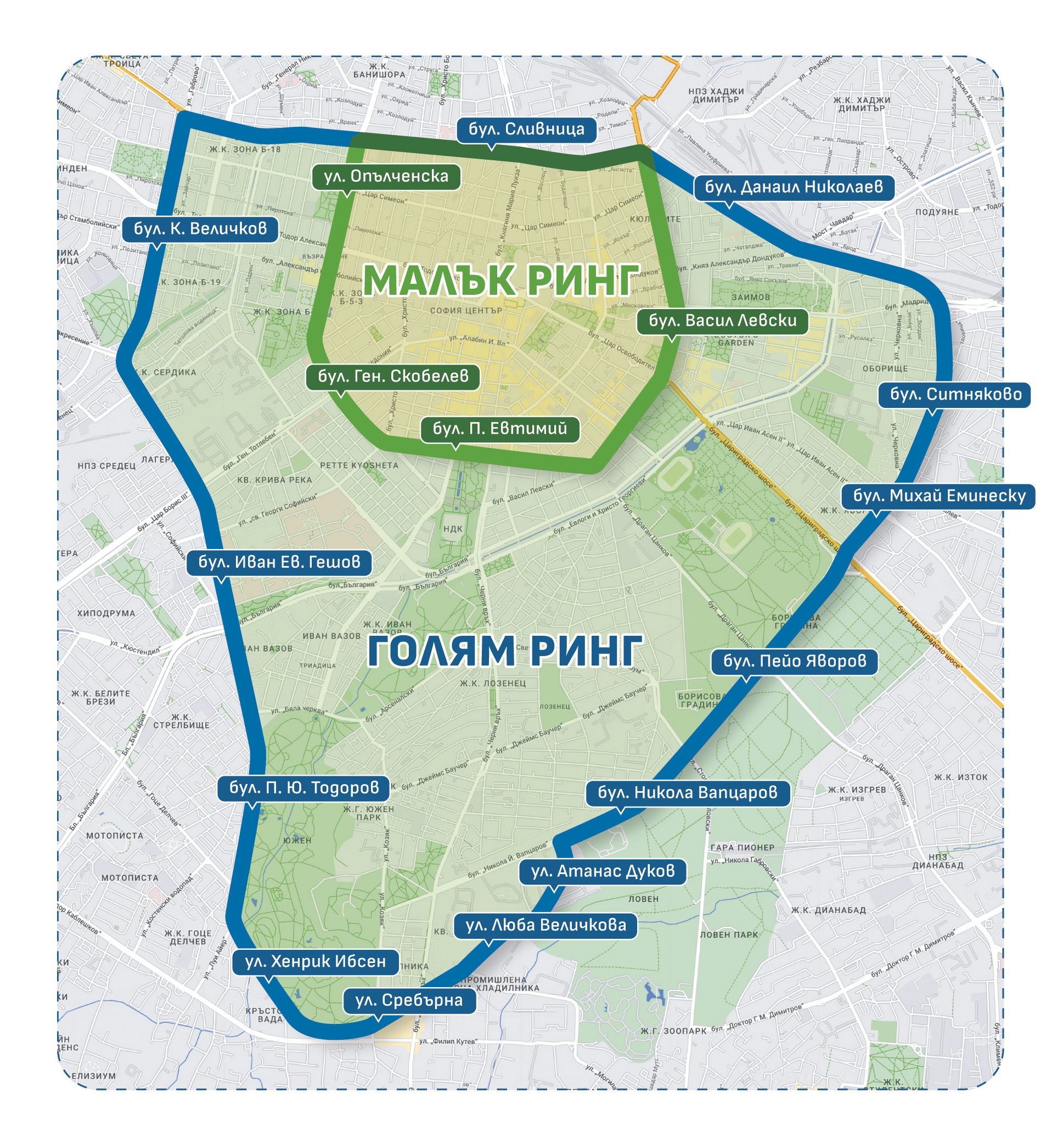 Зоната с ограничения – “Голям ринг”, е заключена между: бул. „Сливница“; бул. „Данаил Николаев“; бул. „Ситняково“; бул. „Михай Еминеску“; бул. „Пейо Яворов“; бул. „Никола Вапцаров“; ул. „Атанас Дуков“; ул. „Люба Величкова“; ул. „Сребърна“; ул. „Хенрик Ибсен“; бул. „П. Ю. Тодоров“; бул. „Иван Ев. Гешов“; бул. „К. Величков“.