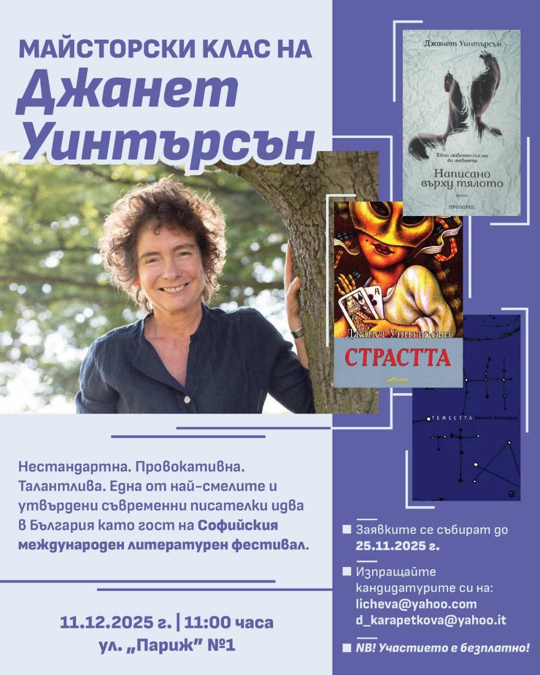 На 11 декември от 11:00 ч. в сградата на Столичната община на ул. "Париж" № 1, в рамките на програмата на Международен литературен фестивал, ще се проведе Майсторски клас на писателката Джанет Уинтърсън.