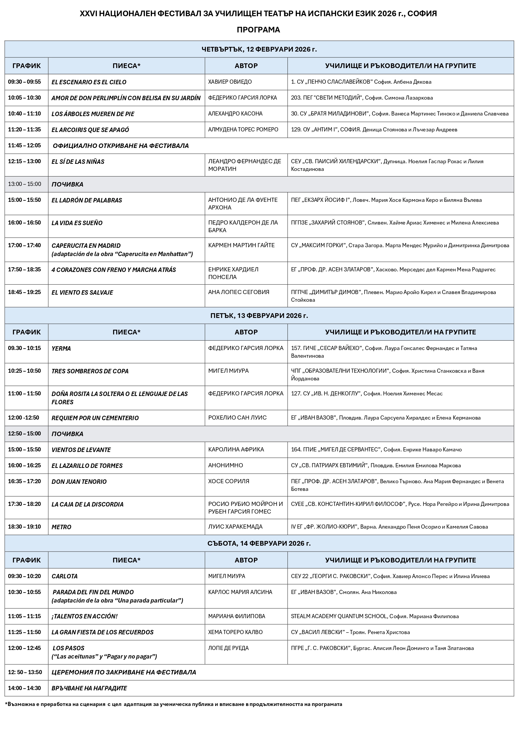 На 12, 13 и 14 февруари в София се провежда XXVI Национален фестивал за училищен театър на испански език. Във фестивала, организиран от отдел "Образование" към Посолството на Испания в България, участват ученически групи от 24 училища от цялата страна.