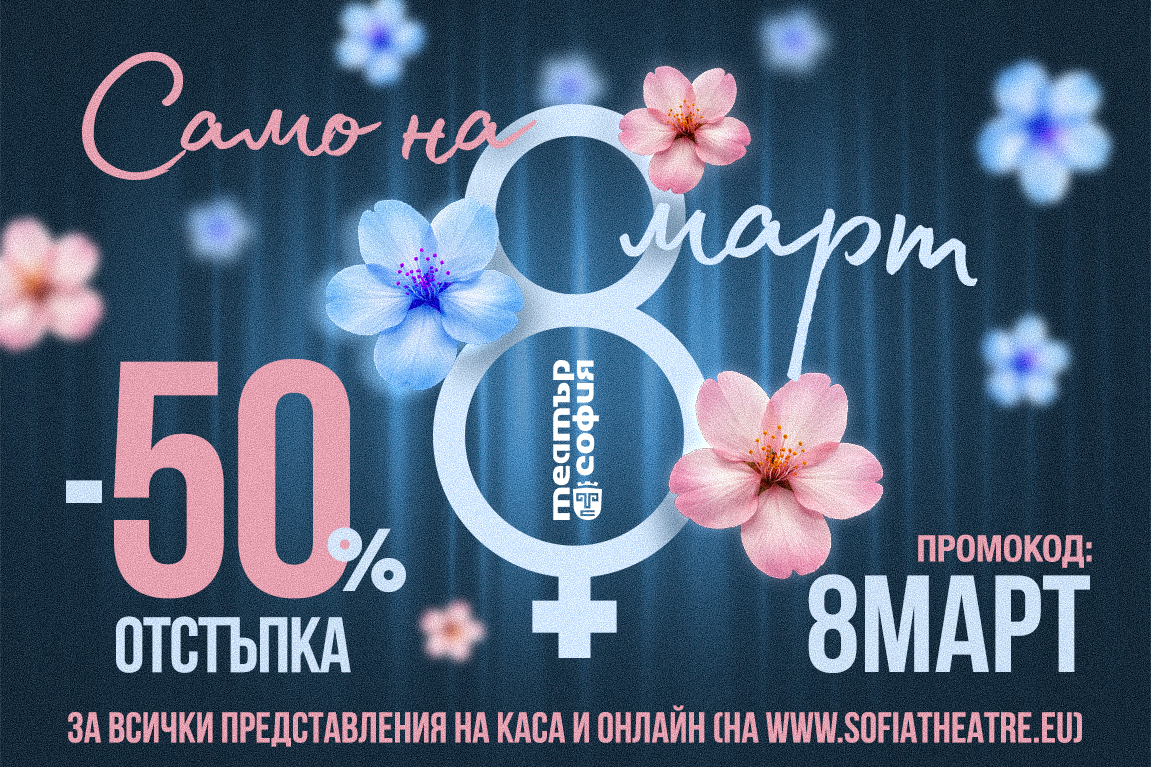 - и онлайн с промокод 8МАРТ, като се регистрирате на https://sofiatheatre.eu/ и въведете промокод 8МАРТ (изписан с главни букви).