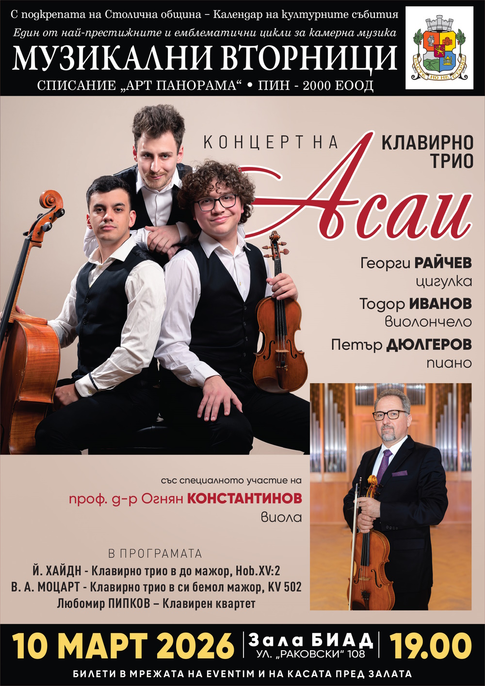 На 10 март в Концертна зала БИАД от 19.00 ч. ще се проведе вълнуващ за любителите на класическата музика концерт на трио „Асай“ с участието на известния виолист проф. Огнян Константинов.