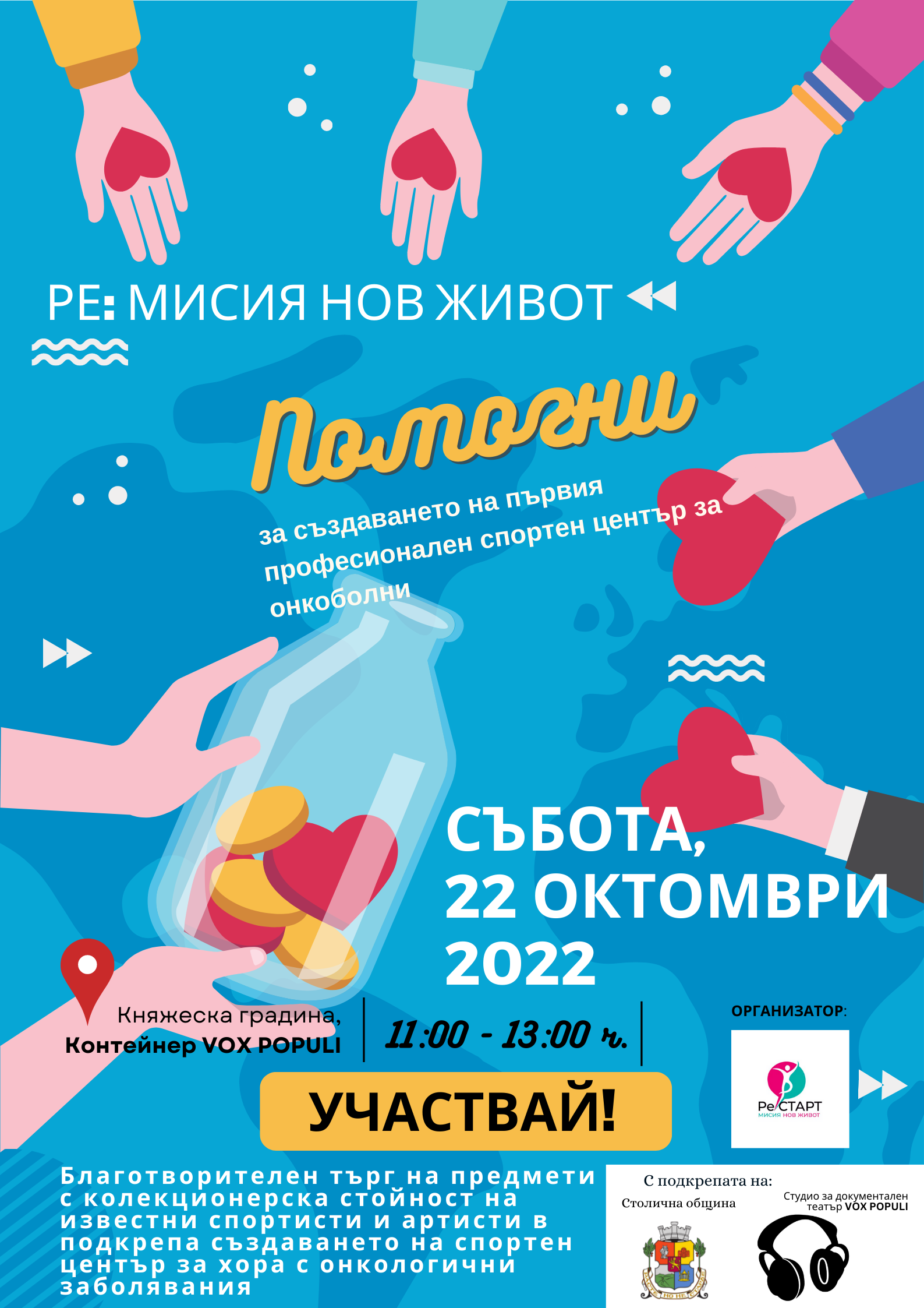 На 22 октомври от 11:00 ч., на откритата сцена на VOX POPULI в "Княжеска градина", ще бъде даден официален старт на благотворителен търг „Рe: МИСИЯ НОВ ЖИВОТ“. За всеки предоставен предмет от звездните участници ще може да се наддава онлайн – от 22.10.2022 г. до 23.11.2022 г., в страницата на Фондацията във фейсбук – FB/ReStartFndn.