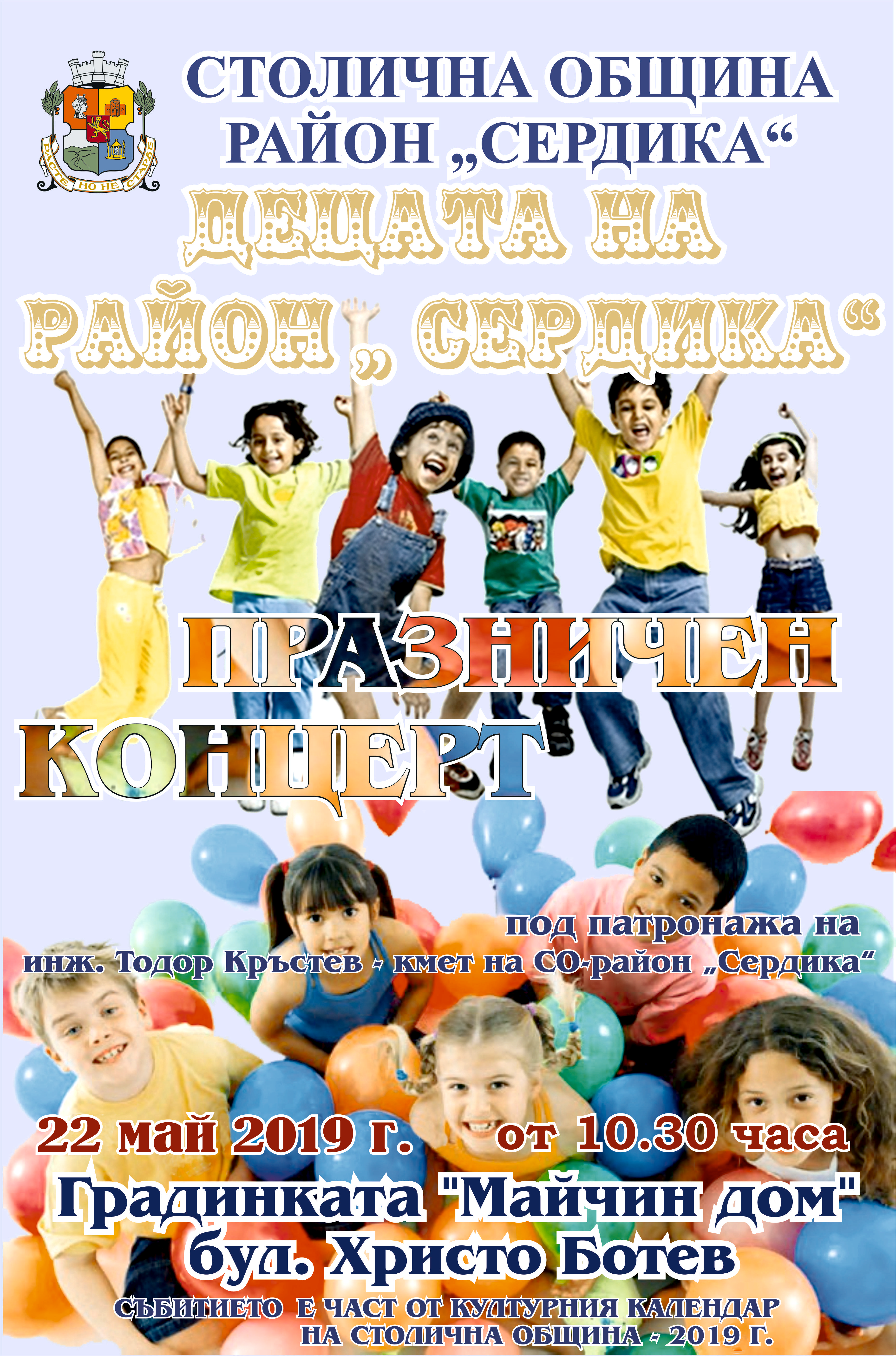 На 22 май (сряда) от 10.30 часа в градинката "Майчин дом" (на бул. "Христо Ботев") за десета поредна година район "Сердика" на Столичната община организира празничен концерт "Децата на район "Сердика", посветен на Деня на българската просвета и култура и на славянската писменост.