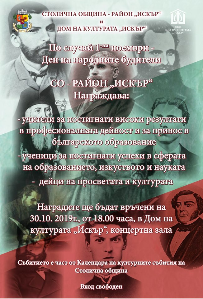 За трета поредна година район „Искър“ и Общински културен институт Дом на културата „Искър“ организират церемония по награждаването на преподаватели от район „Искър“. Инициативата е по повод Деня на народните будители – 1 ноември.
