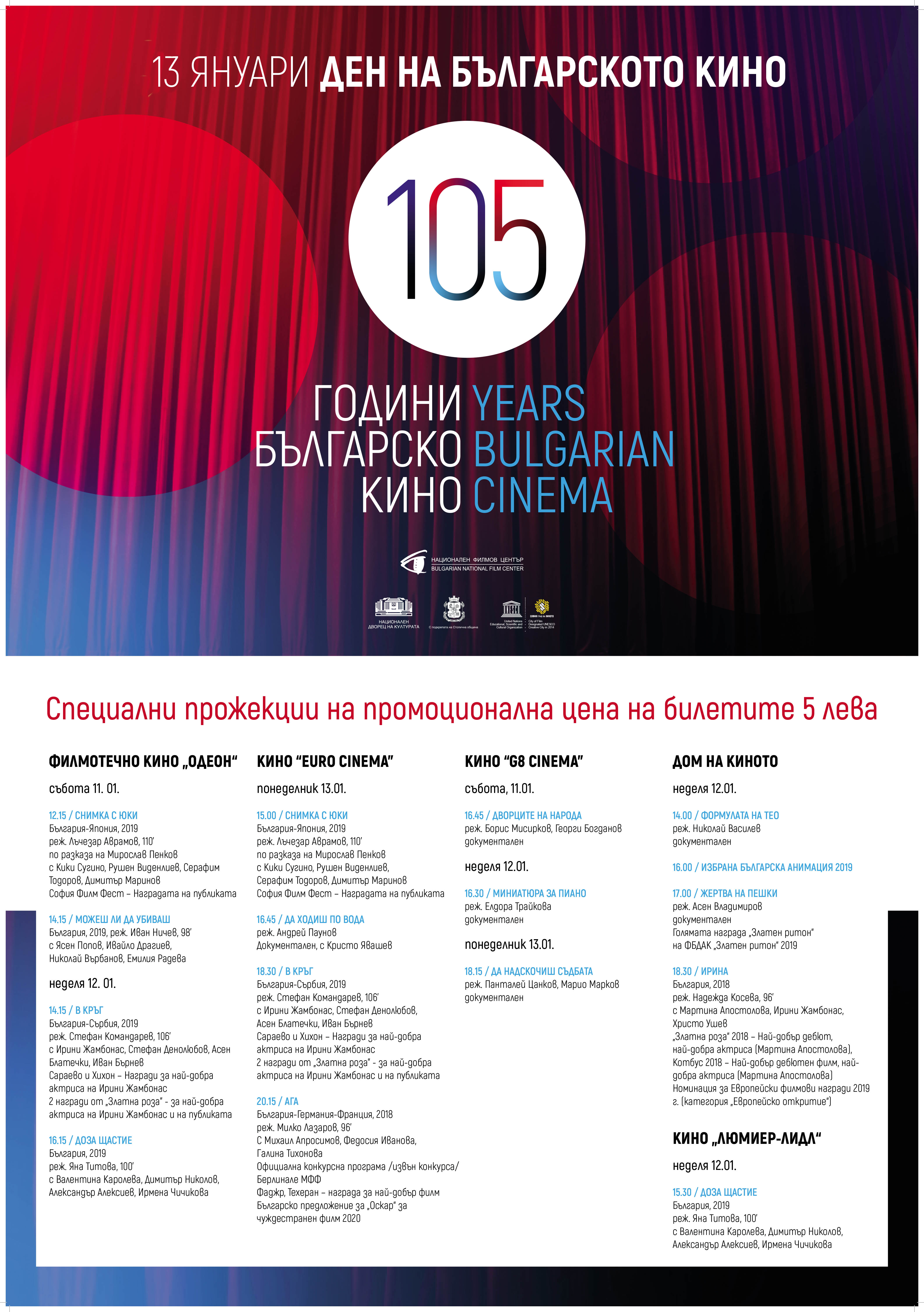 На 13 януари отбелязваме 105 години българско кино, а от 11 до 13 януари в пет софийски киносалона: "Одеон", "Дом на киното", "Люмиер – Лидл", G8 и Euro Cinema ще бъдат прожектирани български филми. Цената на билета е 5 лева.