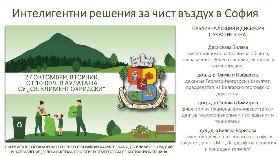 На 27 октомври в Аулата на Софийския университет от 10:00 часа ще се проведе публична лекция и дискусия за търсене на интелигентни решения за чистотата на въздуха в столицата.