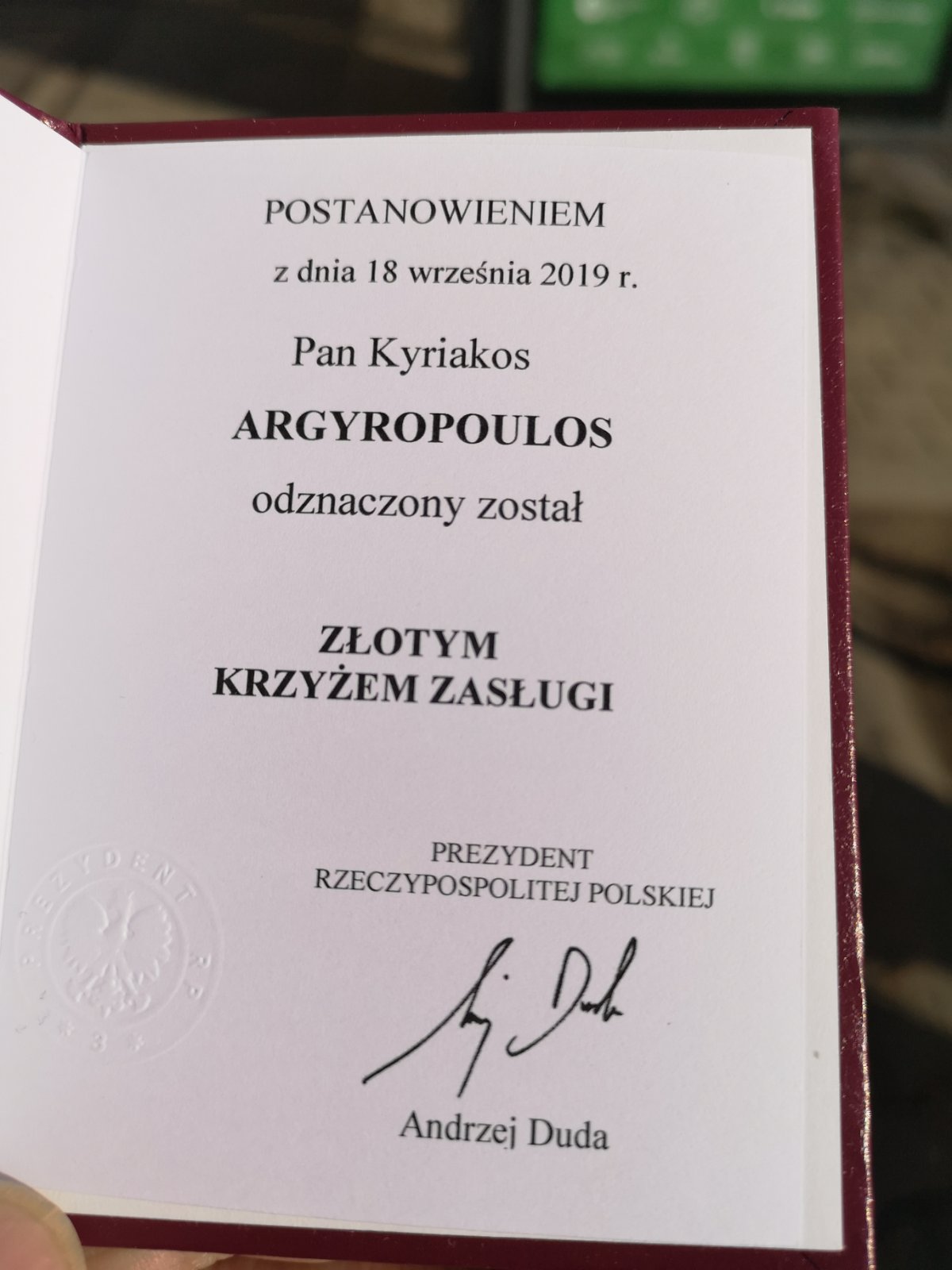 Отличието му беше присъдено с Указ на президента на Република Полша Анджей Дуда от 18 септември 2019 г.