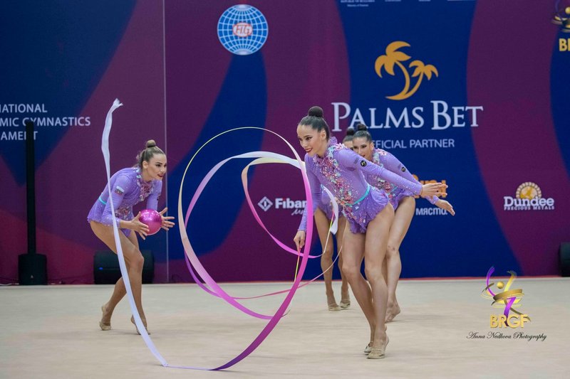 Олимпийските шампионки от ансамбъла по художествена гимнастика от Токио 2020 Симона Дянкова, Мадлен Радуканова, Ерика Зафирова, Стефани Кирякова и Лаура Траатс изпълниха съчетание с пет обръча и пет топки.
