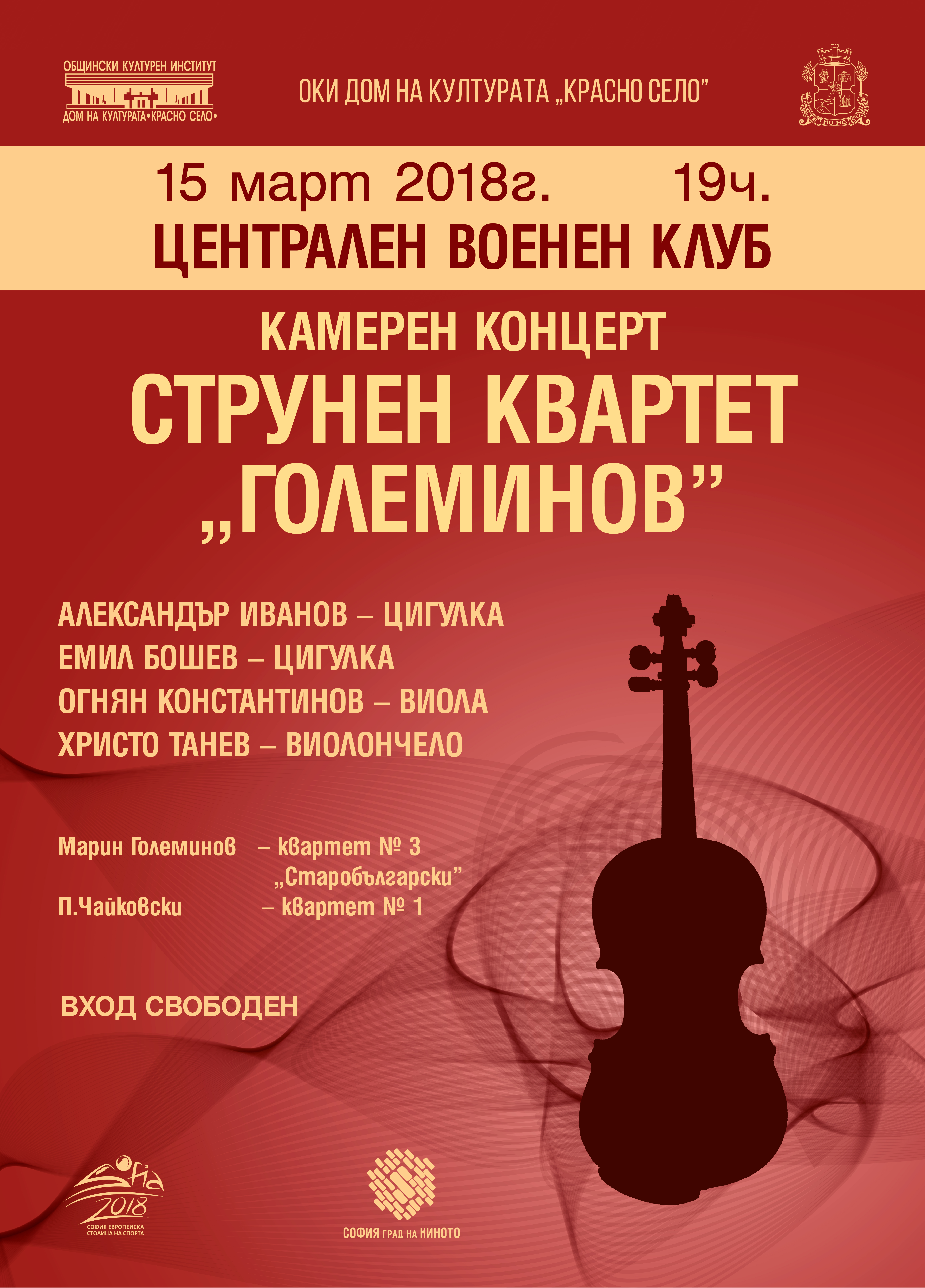 ОБЯВЕНИЯТ В ПРОГРАМАТА НА ИНСТИТУТА КОНЦЕРТ НА КВАРТЕТ ГОЛЕМИНОВ НА 15 МАРТ В ЦЕНТРАЛЕН ВОЕНЕН КЛУБ СЕ ОТМЕНЯ ПОРАДИ ЗАБОЛЯВАНЕ НА ЧЛЕН ОТ СЪСТАВА.