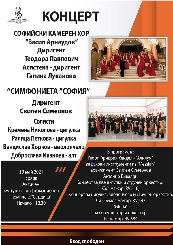 На 19 май (сряда) от 18:30 ч. в Античен културно-информационен комплекс „Сердика“ (под купола на "Ларгото") Симфониета „София“ и Софийски камерен хор „Васил Арнаудов“ ще изнесат съвместен концерт, посветен на 24 май – Деня на Светите братя Кирил и Методий, на българската азбука, просвета и култура и на славянската книжовност.