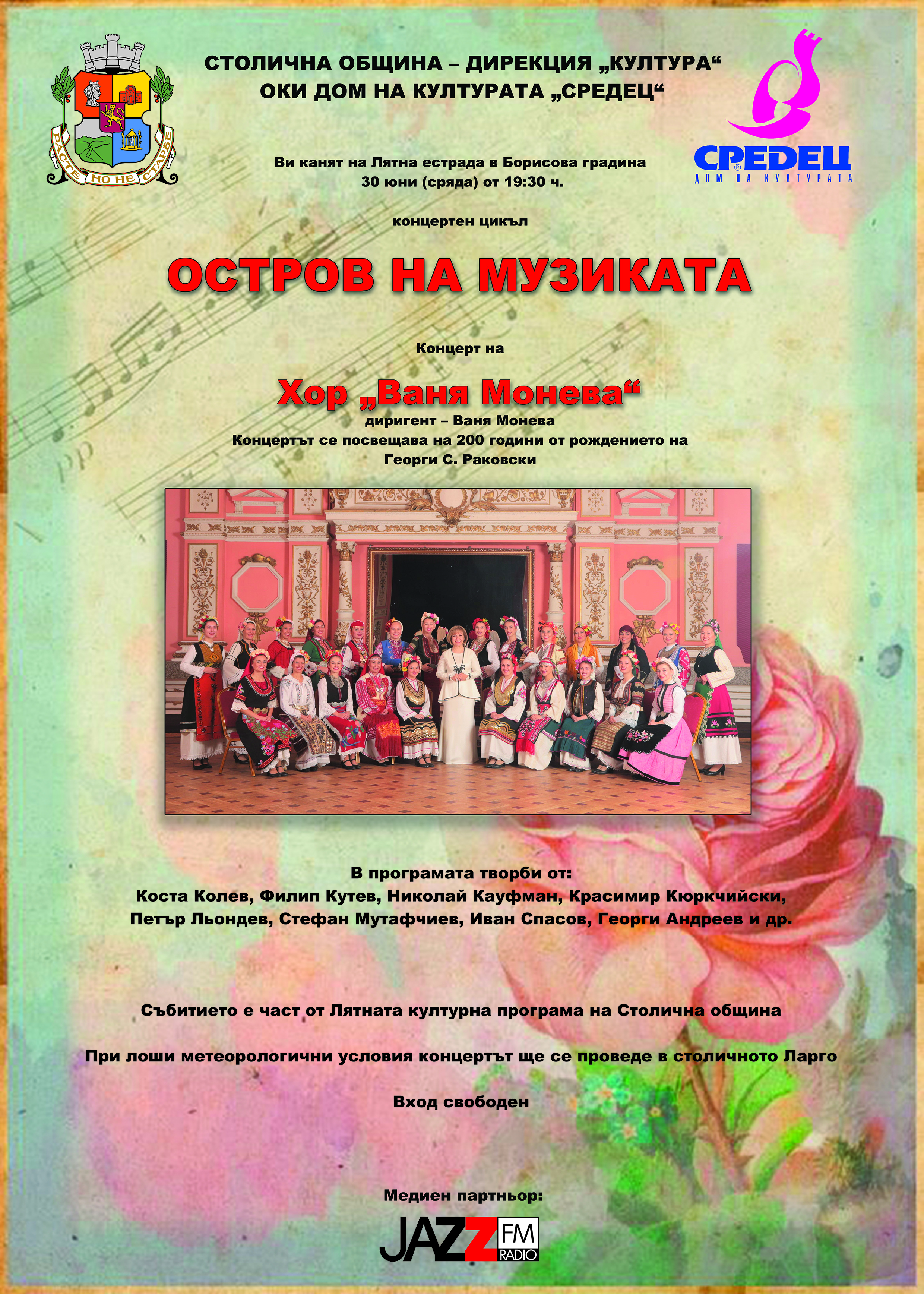 На 30 юни от 19:30 ч. на Лятната естрада ще излезе Хор „Ваня Монева“.