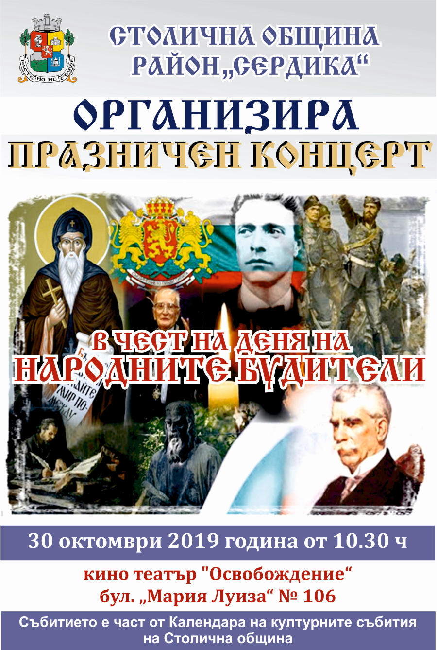 На 30 октомври от 10:30 часа в кино "Освобождение" ще се проведе празничен концерт, посветен на 1 ноември – Деня на народните будители.