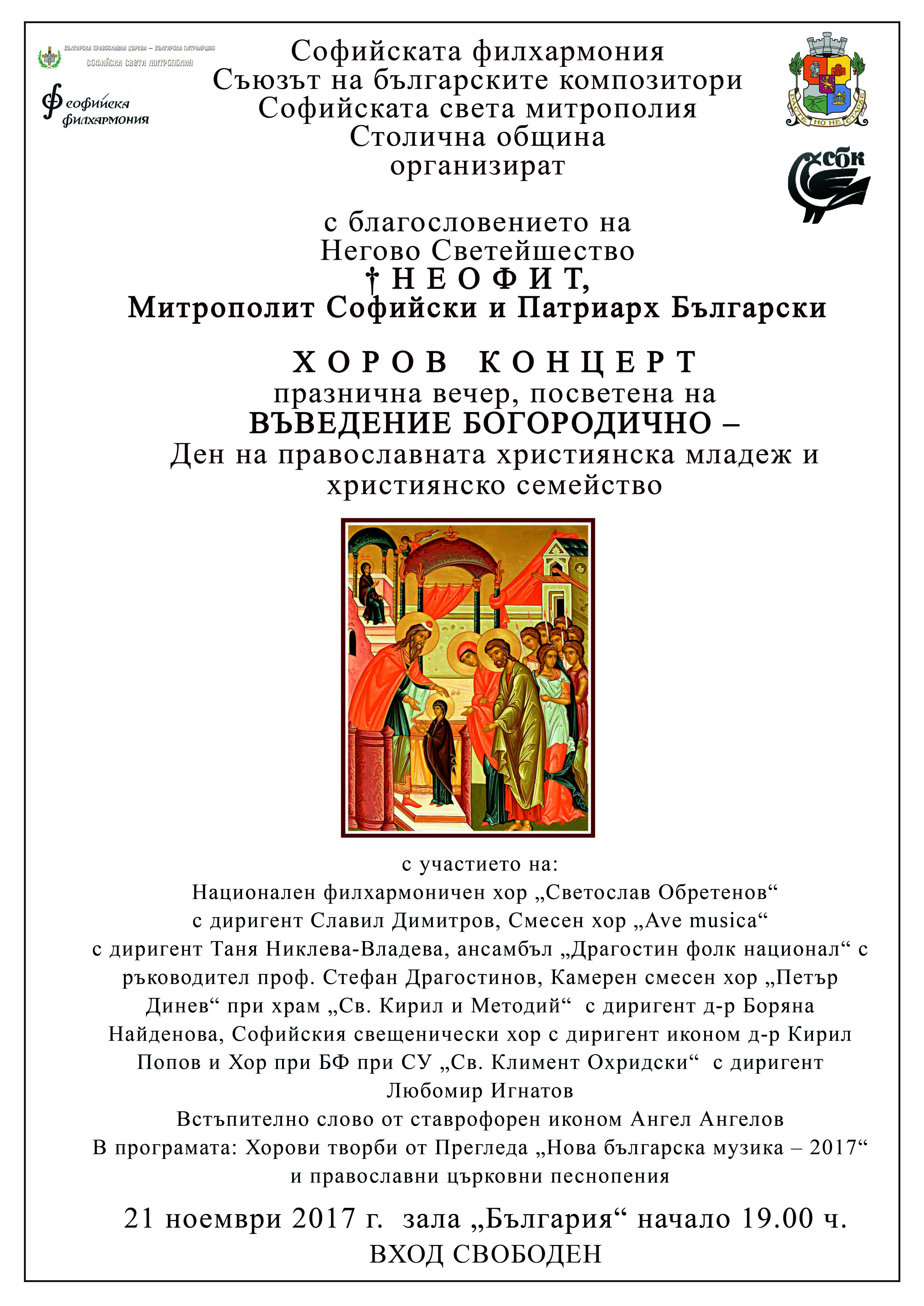 Софийската филхармония, Съюзът на българските композитори, Софийската света митрополия и Столична община организират с благословението на Негово Светейшество