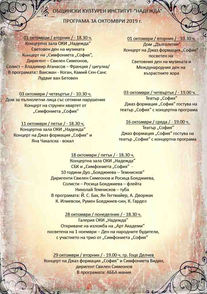 Програма на ОКИ "Надежда" за месец октомври 2019 г.