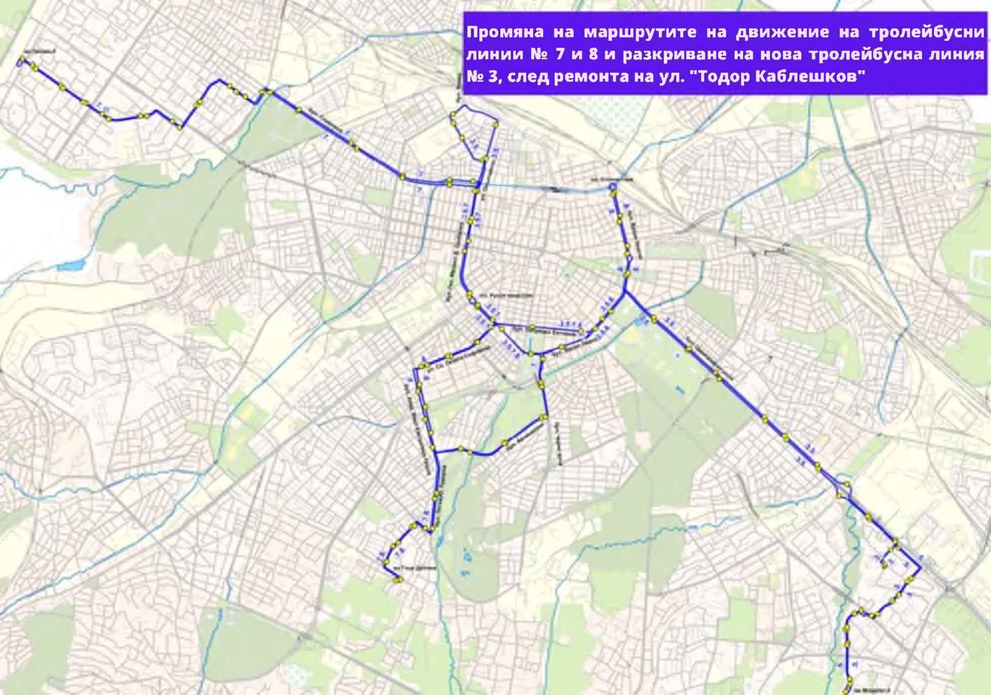 Промяна на маршрутите на движение на тролейбусни линии №№ 7 и 8 и разкриване на нова тролейбусна линия № 3, след ремонта на ул. "Тодор Каблешков"