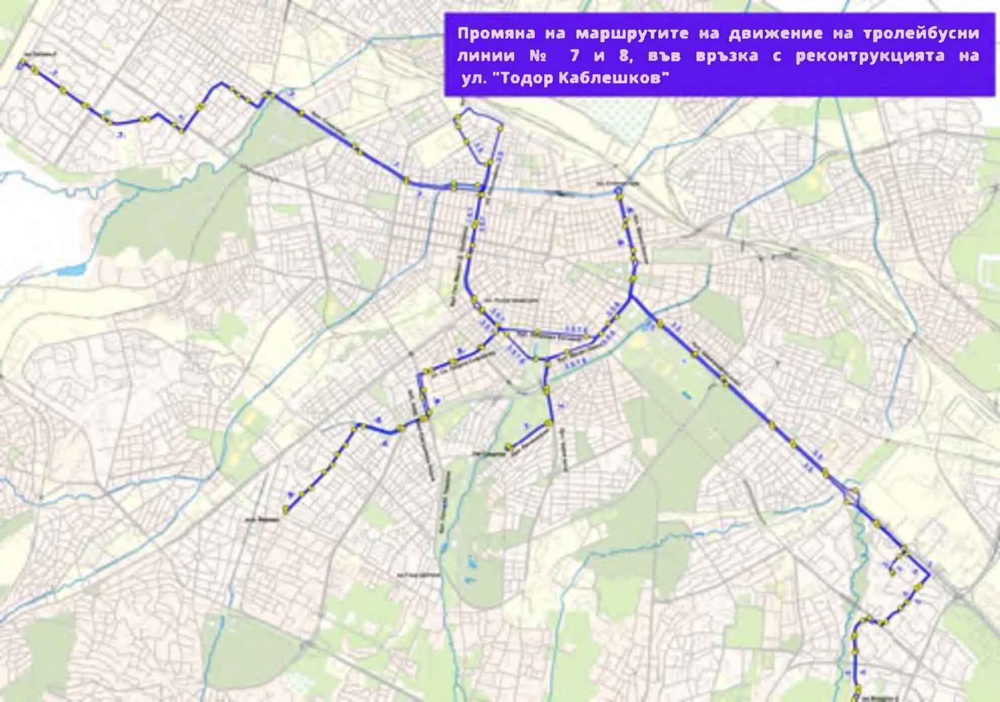 Промяна на маршрутите на движение на тролейбусни линии №№ 7 и 8, във връзка с реконструкцията на ул. "Тодор Каблешков"