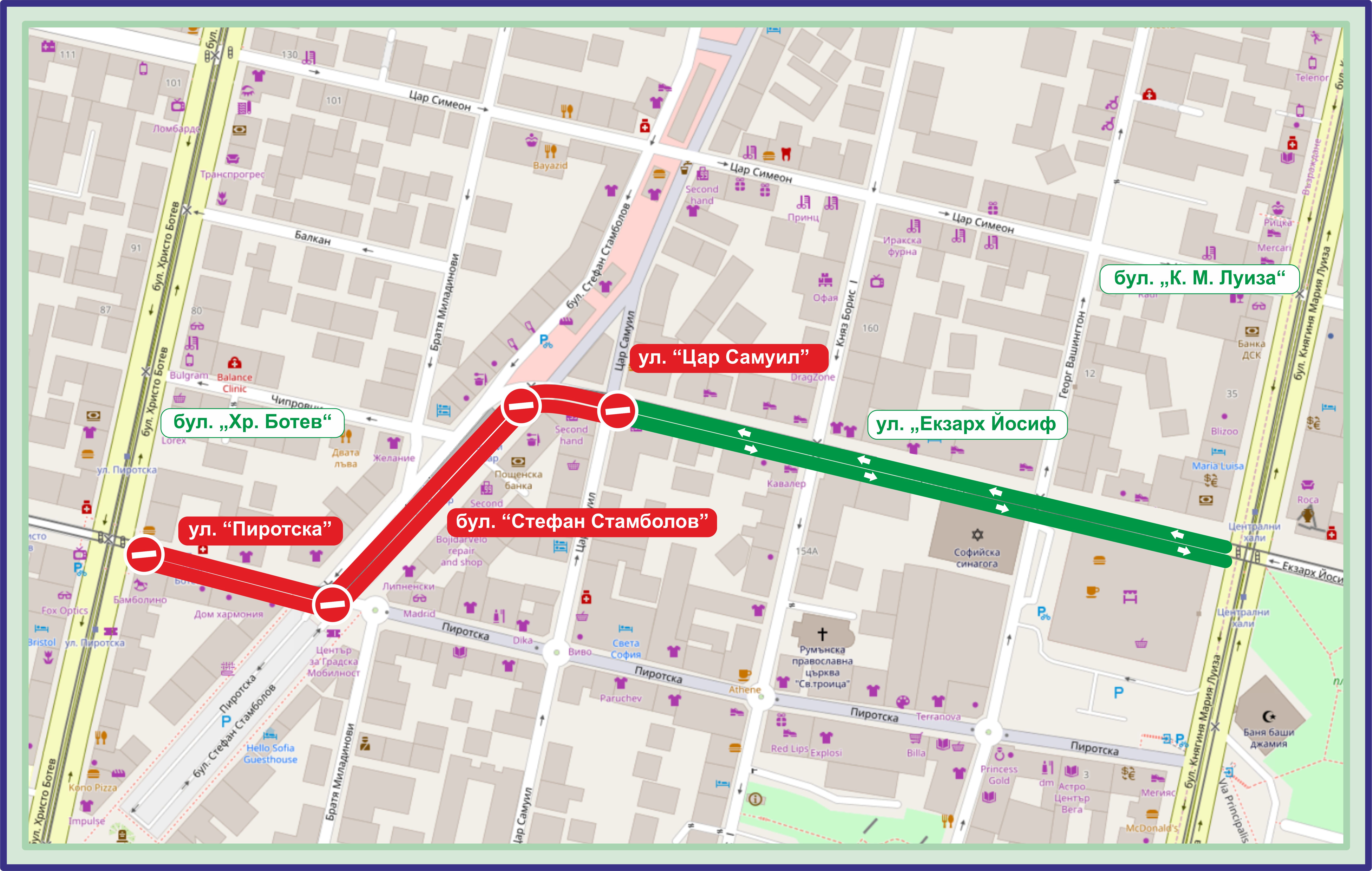 - забранява се влизането на превозни средства по бул. „Стефан Стамболов“ в посока от ул. „Пиротска“ до ул. „Екзарх Йосиф“;