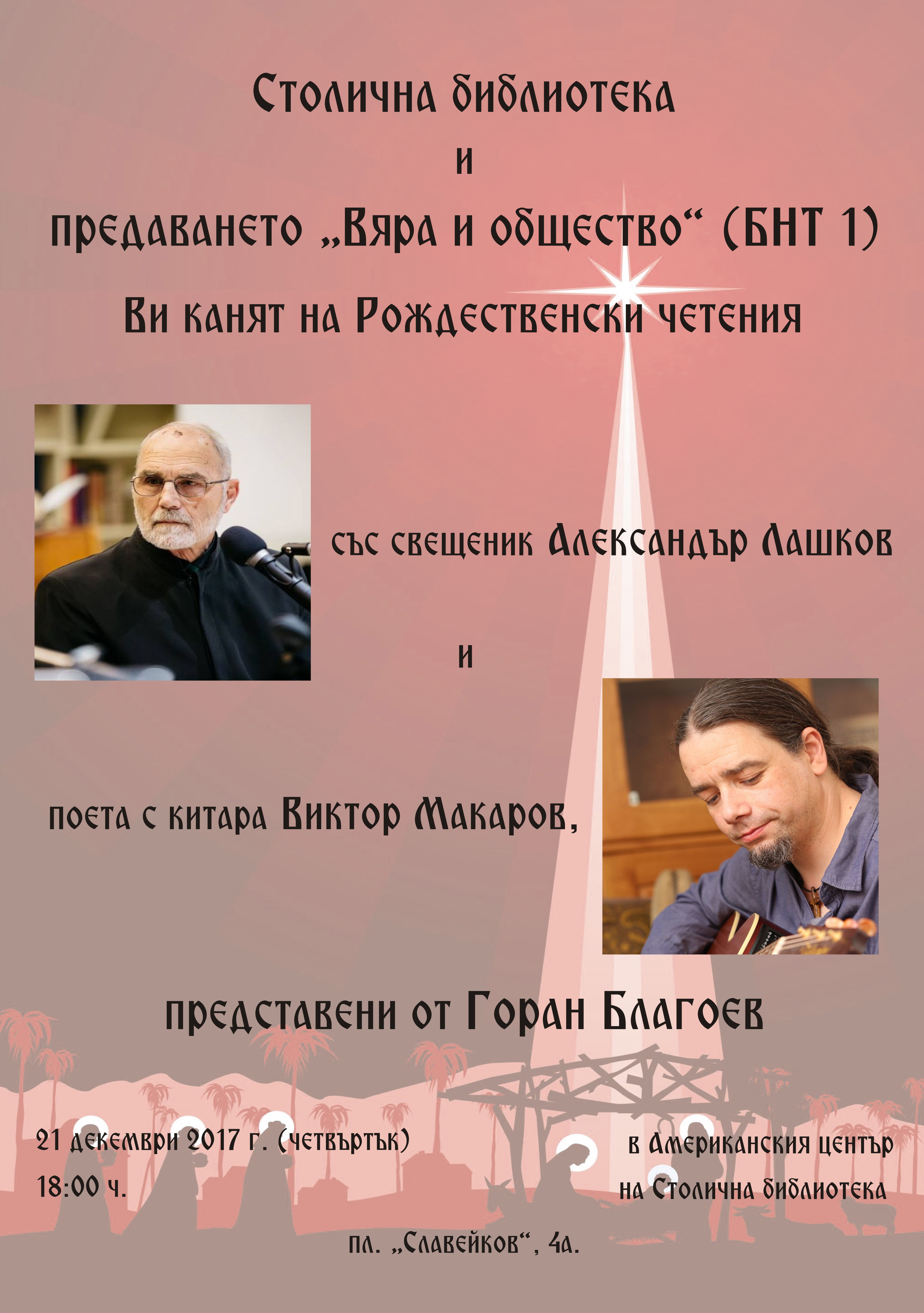 Столична библиотека и предаването „Вяра и общество“ на БНТ 1 Ви канят на Рождественски четения със свещеник Александър Лашков и поета с китара Виктор Макаров, представени от Горан Благоев.