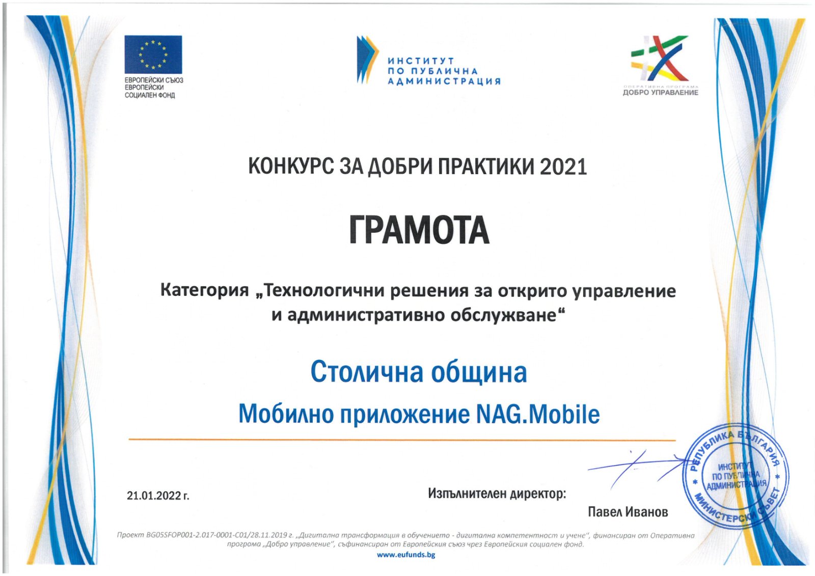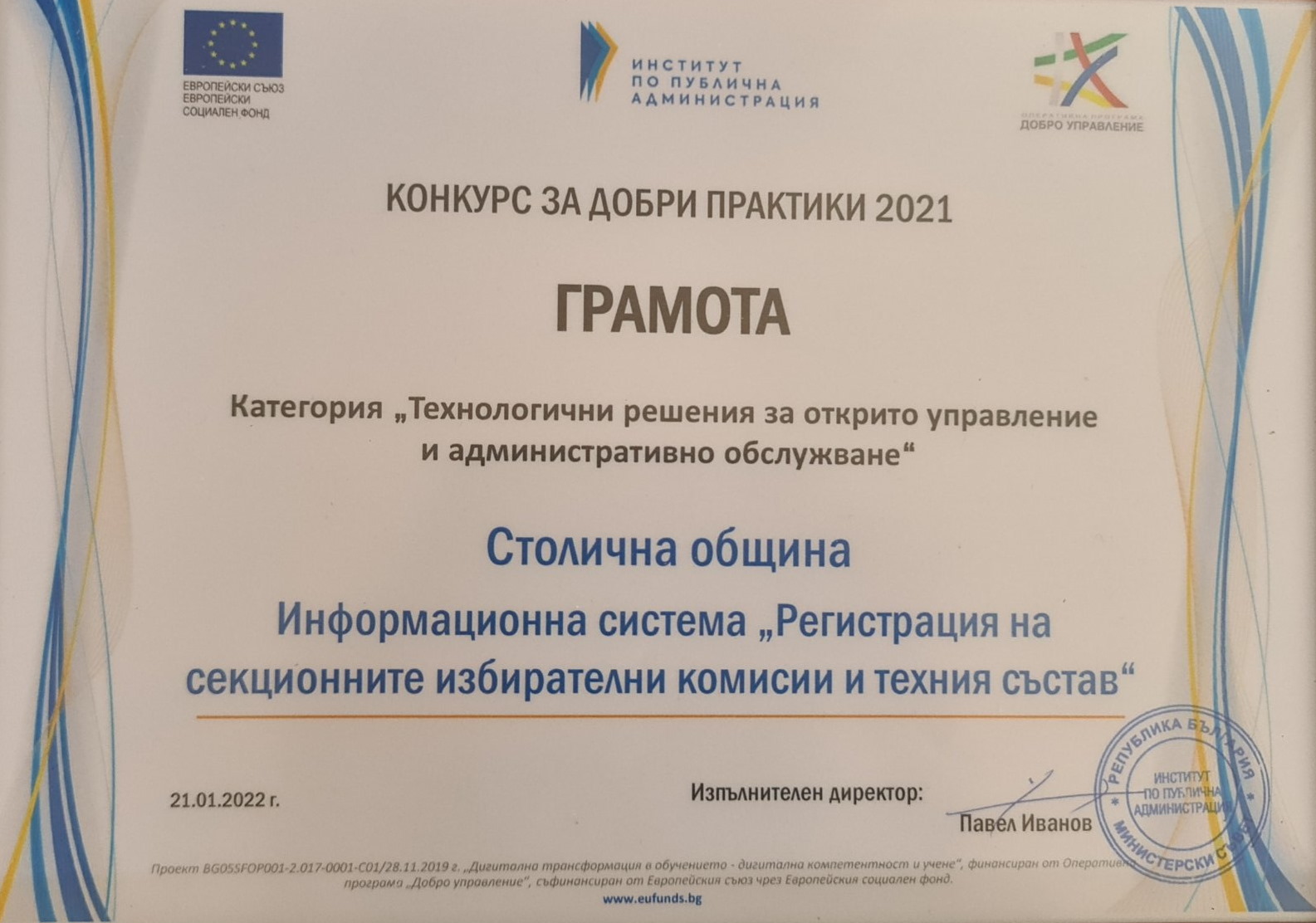 Тазгодишното издание показа сериозна конкуренция между участниците, като често разликата в точките между първенците беше само една. Столична община е отличена в категорията „Технологични решения за открито управление и административно обслужване“ с три награди: за „Дигитална трансформация на общинска услуга „Смяна на адресната регистрация“, за мобилното приложение NAG Mobile към направление „Архитектура и геодезия“ и за информационна система "Регистрация на секционните избирателни комисии и техния състав". Г-н Павел Иванов, директор на ИПА, и журито на инициативата споделиха, че София е лидер в споделянето на добри практики и наличието на иновативни подходи в администрацията. За да приемат наградите, на церемонията присъстваха ръководителите на трите направления, отговорни за отличените нововъведения: Генчо Керезов, зам.-кмет на направление „Дигитализация, иновации и икономическо развитие“, арх. Здравко Здравков, главен архитект на София, и Венера Милова, секретар на Столична община и ръководител на направление „Общинска администрация“. Те изразиха благодарността си от това, че трудът на общината и екипите, работили през изминалата изпълнена с предизвикателства година, е оценен. Столична община получи и специална Грамота в категорията за проекта „Пясъчник за иновации“.
