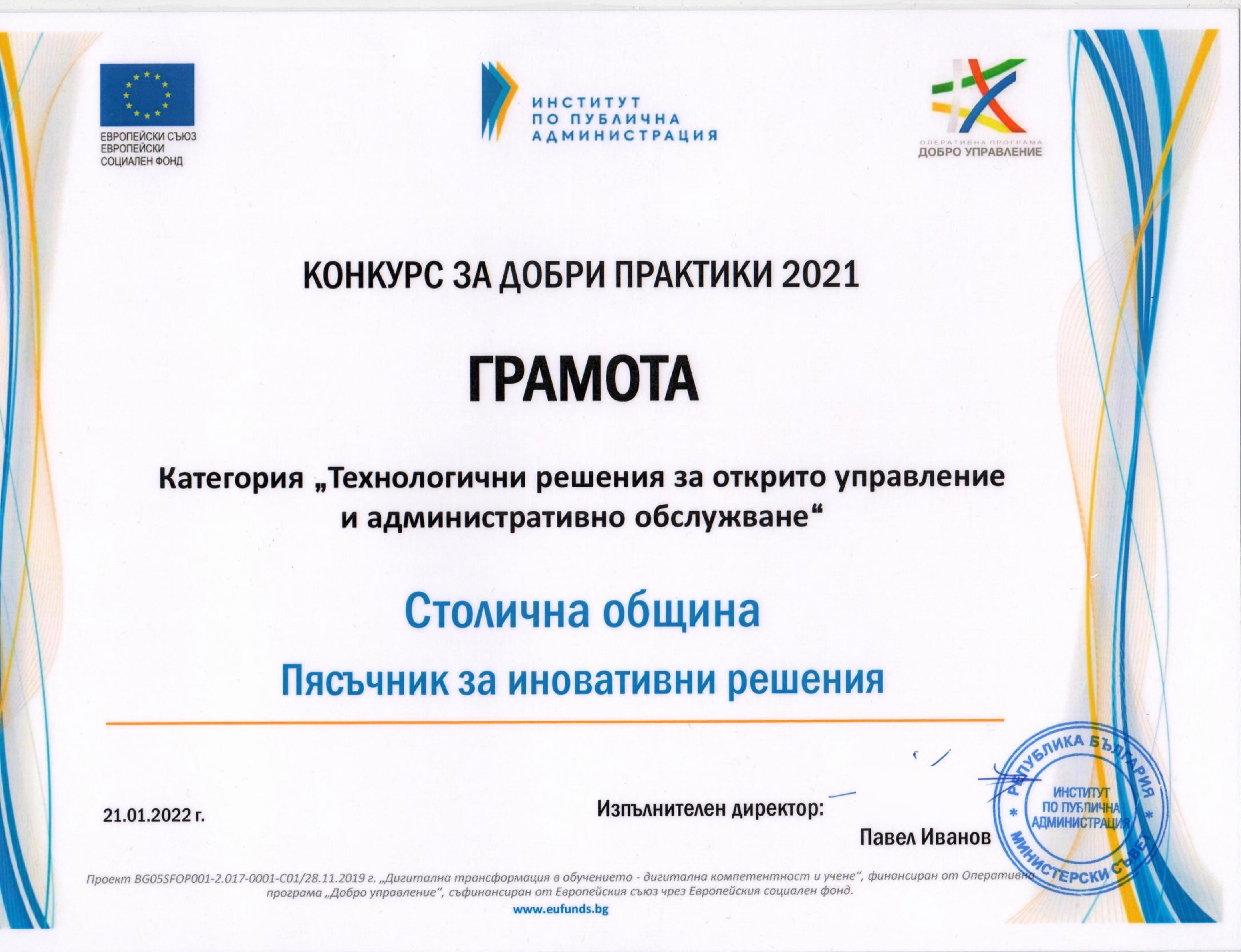 Столичната община получи 4 награди за добри практики в администрацията за 2021 година. На събитието, организирано от Института по публична администрация (ИПА), Столична община бе отличена за някои от най-разпознаваемите иновативни решения в дейността ѝ.