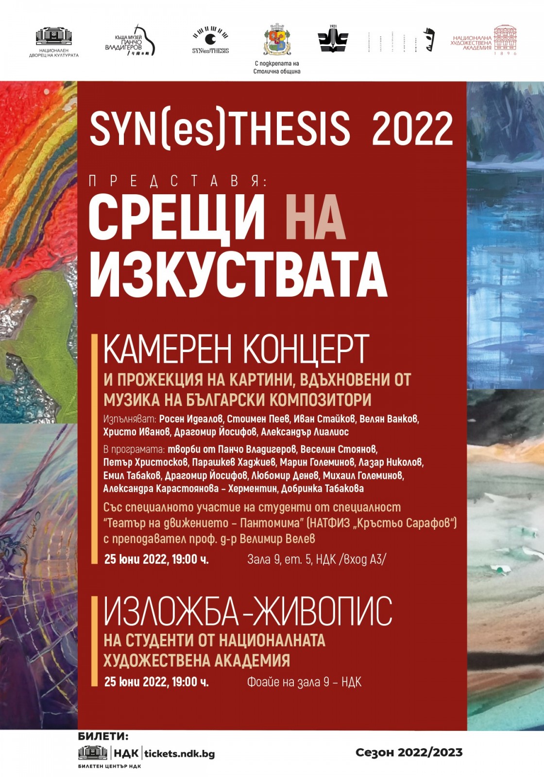 На 25 юни от 19:00 ч. в зала № 9 на НДК ще се проведе първото за годината издание на творческия проект SYN(es)THESIS, който се реализира с финансовата подкрепа на Столична програма „Култура“. Новото представяне на проекта утвърждава досегашната му концепция за взаимодействие между различните изкуства, като надгражда сътрудничество с още една образователна институция – Националната академия за театрално и филмово изкуство "Кръстьо Сарафов".