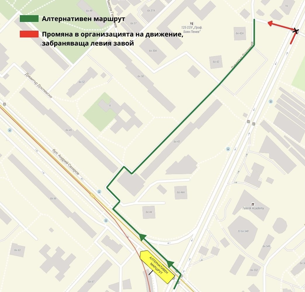- Ляв завой на кръстовището на бул. “Ал. Малинов“ и бул. “А. Сахаров“ и десен завой към ул. “Димитър Доспевски“;