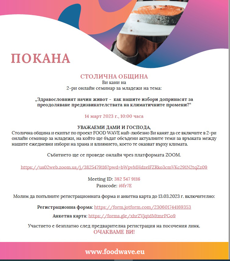 Столична община и екипът по проект FOOD WAVE най-любезно Ви канят да се включите във 2-ри онлайн семинар за младежи, на който ще бъдат обсъдени актуалните теми за връзката между нашите ежедневни избори на храна и влиянието, което те оказват върху климата.