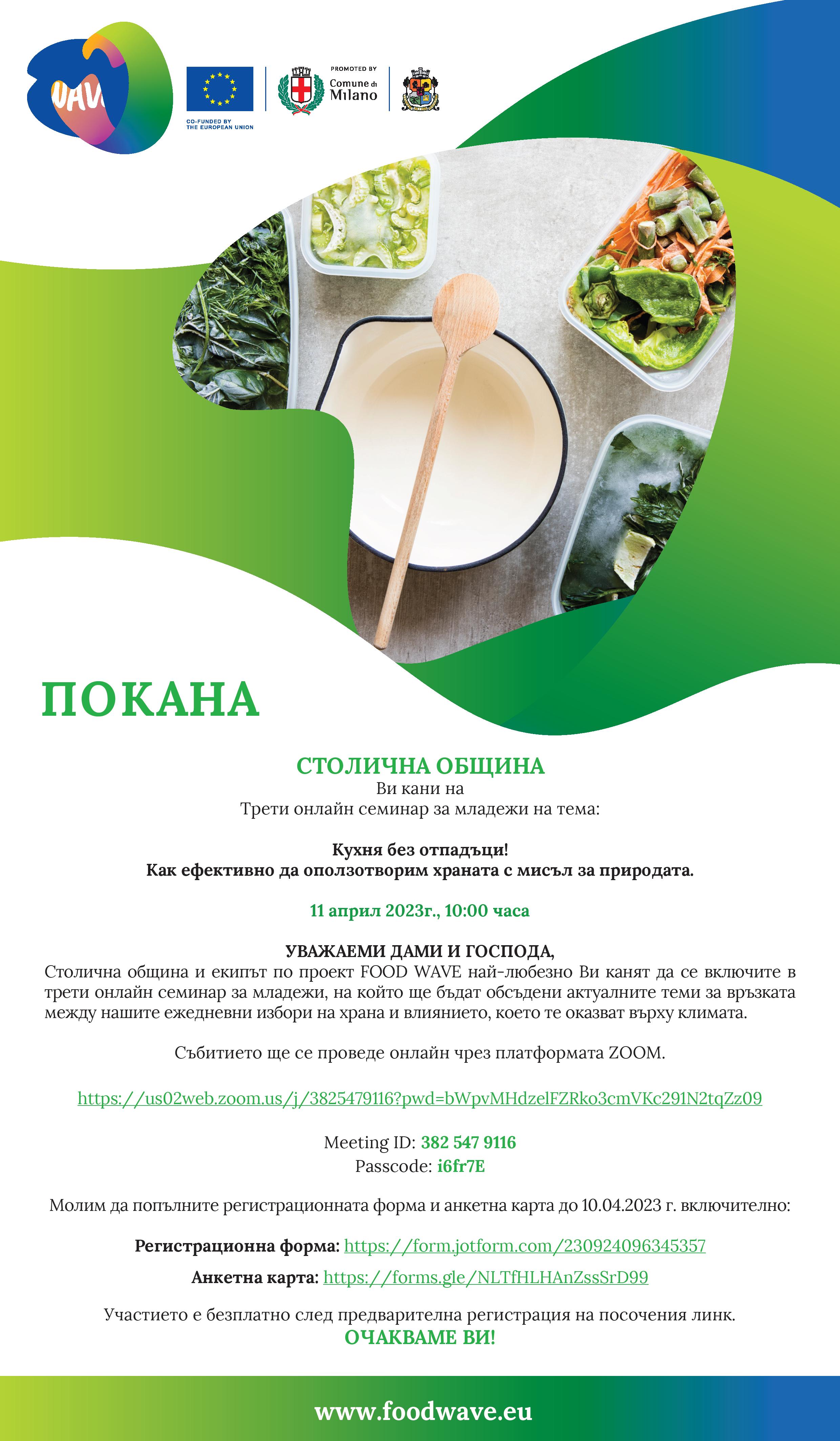 Столична община и екипът по проект FOOD WAVE най-любезно Ви канят да се включите в трети онлайн семинар за младежи, на който ще бъдат обсъдени актуалните теми за връзката между нашите ежедневни избори на храна и влиянието, което те оказват върху климата.
