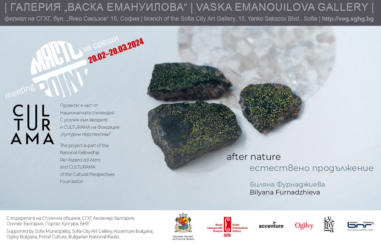 The exhibition is made possible by the Cultural Perspectives Foundation in partnership with the Sofia City Art Gallery and with kind support from the Culture Programme of the Capital City Municipal Authority, Accenture Bulgaria, Ogilvy Group Bulgaria, the Culture Portal, the Bulgarian National Radio.