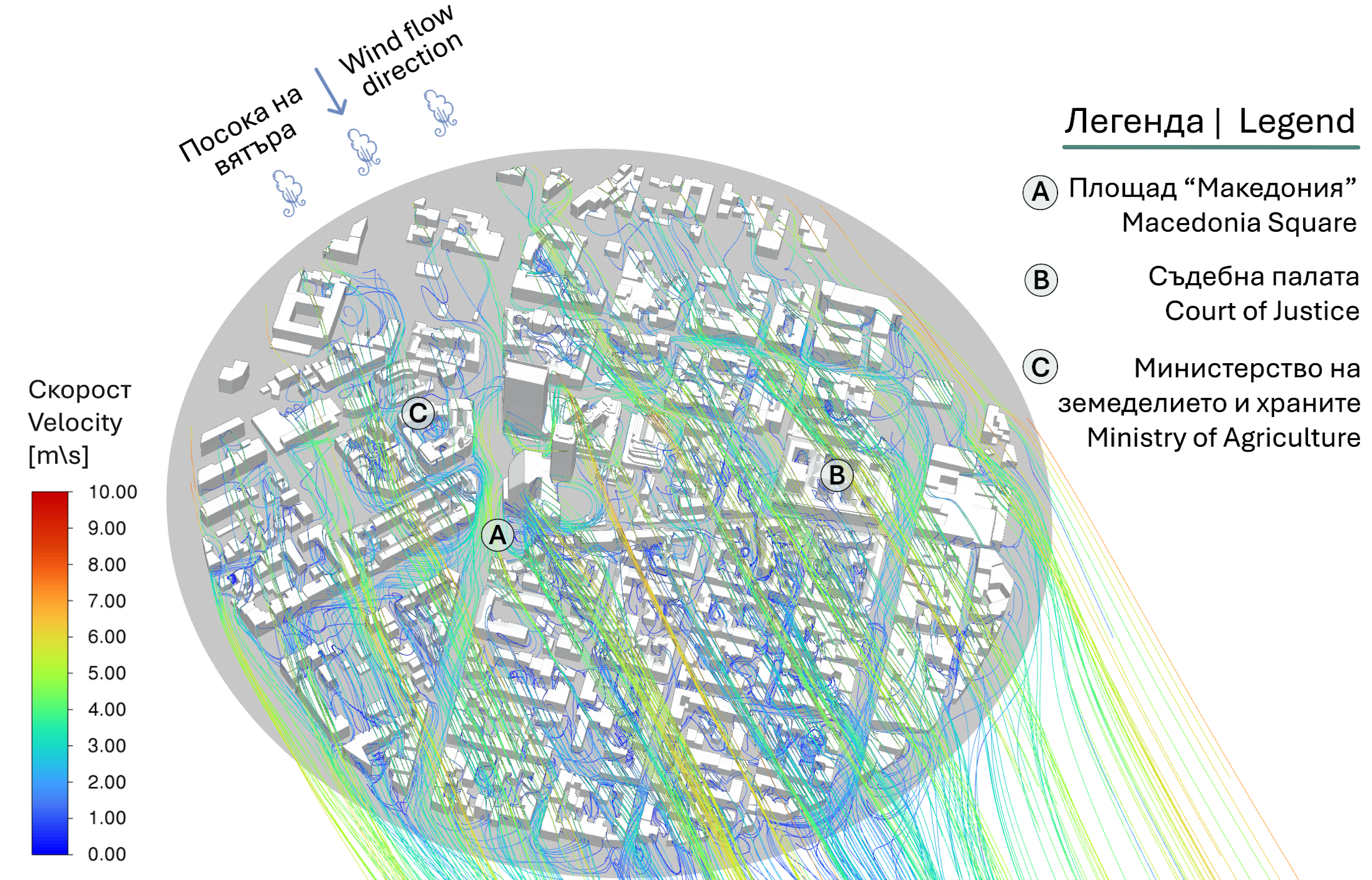 Картите визуализират траекториите на въздушните течения в район от центъра на София при преобладаващи ветрове от север-северозапад. Анализът е извършен със софтуер за мултифизика – Аnsys®, а за пълно пренасяне в градската среда, резултатите са визуализирани и в Unreal Engine®. Линиите и цветовете илюстрират движението и скоростта на въздуха, разкривайки завихряния и ускорения между високите сгради, които влияят на качеството на въздуха и топлинния комфорт.