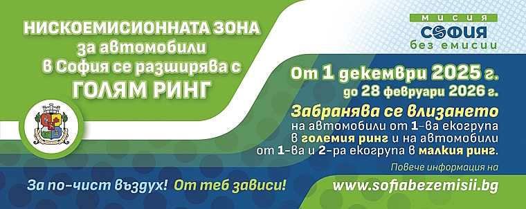 Нискоемисионната зона (НЕЗ) за автомобили в София влиза в сила от 1 декември 2025 г. с разширен обхват и нов „голям ринг“. Припомняме, че от миналата година в „малкия ринг“ е ограничено движението на моторни превозни средства от I и от II екогрупа. Забраната за навлизане в „големия ринг“ важи само за моторни превозни средства от I екогрупа. Забраната за влизане в центъра на столицата има за цел да подобри чистотата на въздуха и ще важи в периода на зимните месеци – от 1 декември 2025 г. до 28 февруари 2026 г.