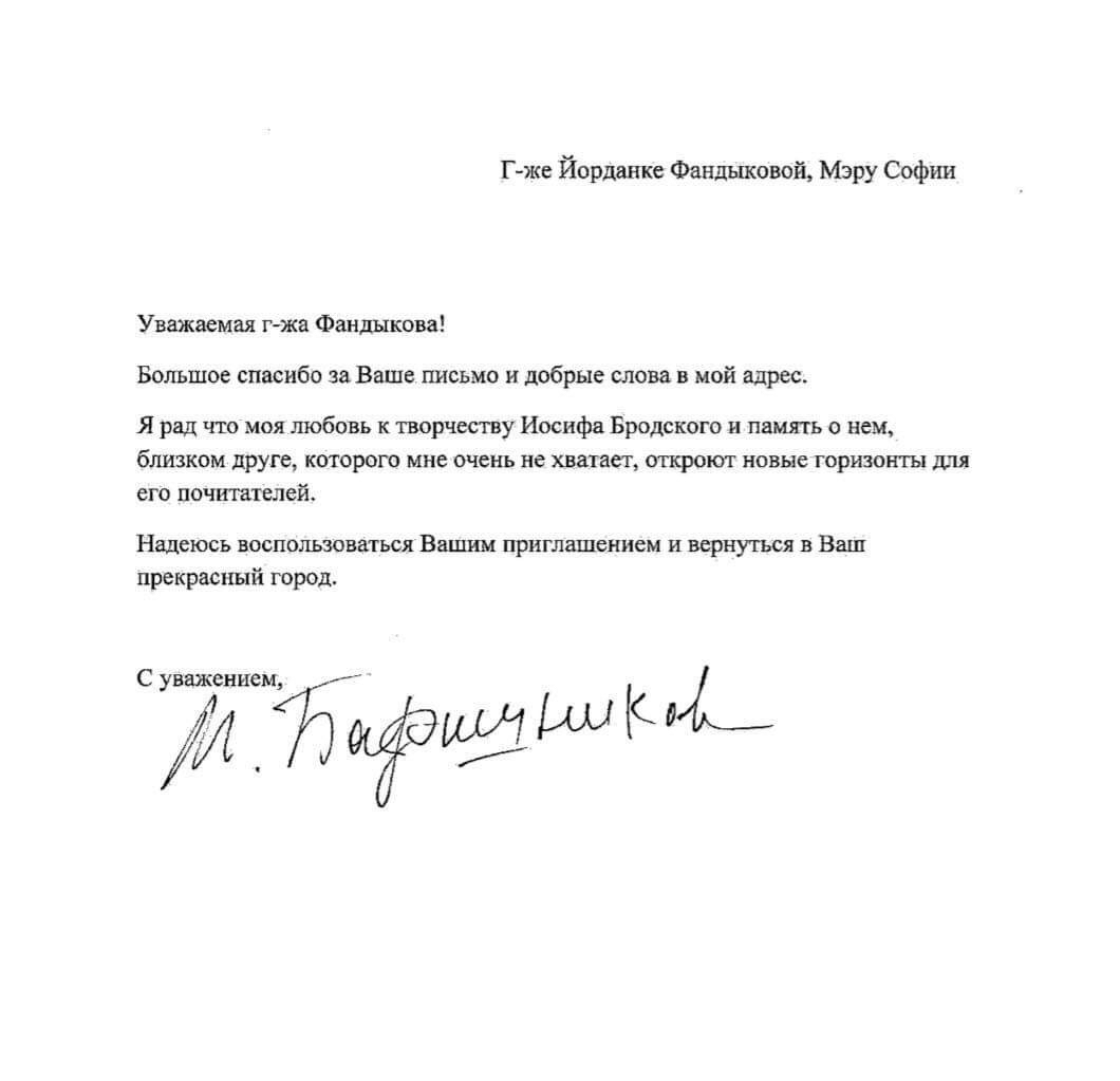Месец след двата си спектакъла в Софийската опера световноизвестният балетист и хореограф написа в писмо до кмета Йорданка Фандъкова, че се надява отново да дойде в София. „Надявам се да се възползвам от Вашата покана и да се върна във Вашия прекрасен град“ – пише Михаил Баришников. И още: „Радвам се, че любовта ми към творчеството на Йосиф Бродски и споменът за него, близък приятел, който наистина ми липсва, ще отвори нови хоризонти за неговите почитатели“.