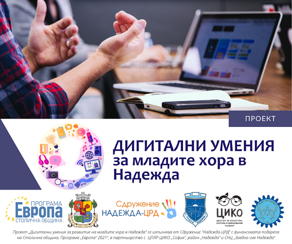 Проект „Дигитални умения за развитие на младите хора в Надежда” се изпълнява от  Сдружение „Надежда – ЦРД“ с финансовата подкрепа на Столична община, Програма „Европа“ 2021“, в партньорство с ЦПЛР ЦИКО „София”, район „Надежда“ и СНЦ „Заедно сме Надежда”