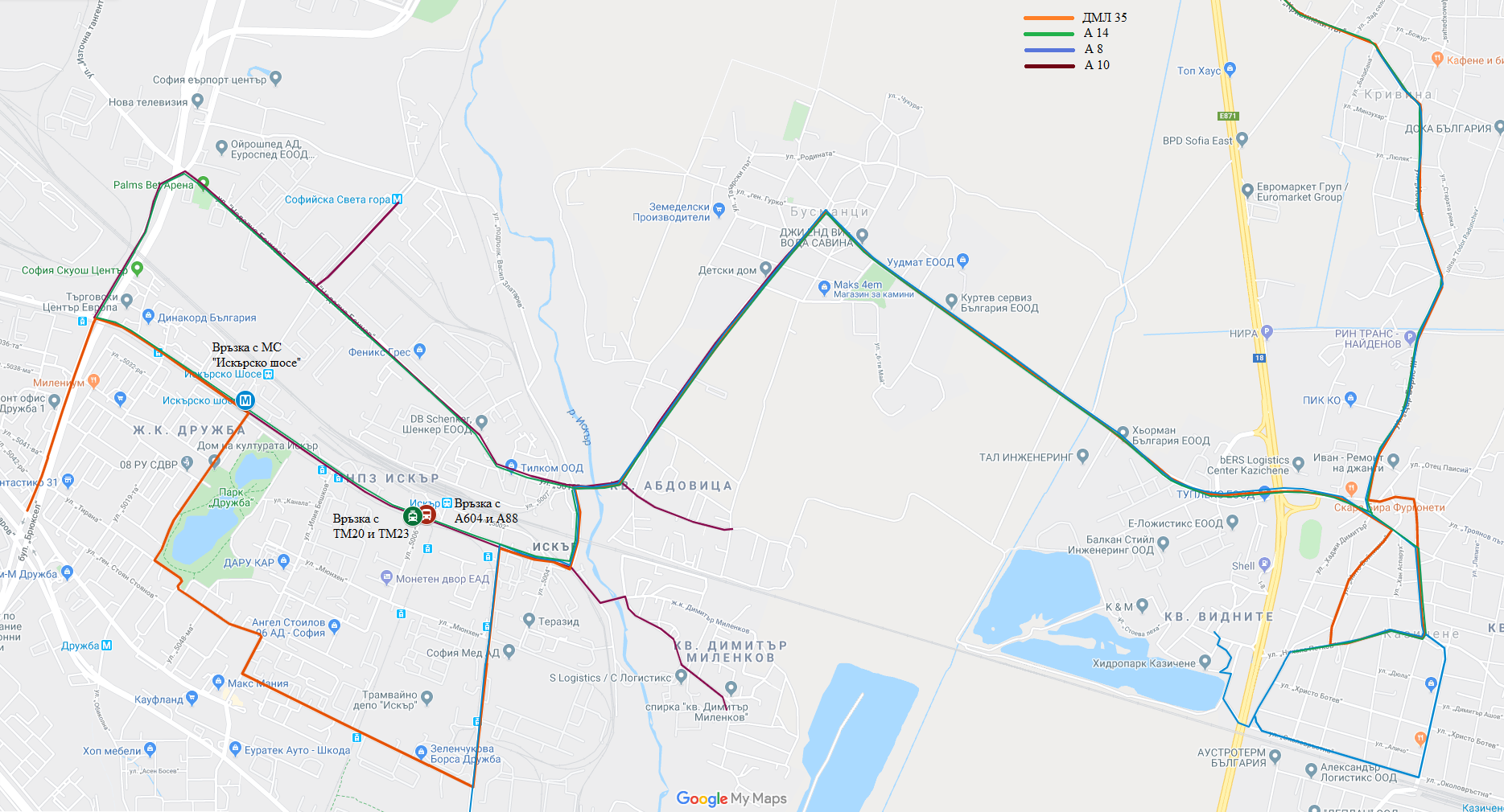 Във връзка с прекратяване обслужването на Допълнителна маршрутна линия № 35 ( с. Кривина до ж.к. „Люлин 1“) от частната фирма превозвач Столичната община с цел защита на публичния интерес е предприела спешни мерки за недопускане нарушаване на транспортната услуга в район "Искър". За целта от 03.02.2020 г. се увеличава броят на обслужващите коли по автобусна линия № 14 (Автостанция "Изток" – гара Искър). Маршрутът на автобусната линия максимално препокрива този на ДМЛ 35 в най-засегнатия участък: с. Кривина, с. Казичене, кв. "Бусманци", ж.к. „Дружба 1“. Интервалът на движение на колите по линията се намалява от 33 мин. на 25 мин., като същата се подпомага и от автобусни линии № 8 (с. Кривина – с. Герман) и № 10 (с. Бусманци – кв. “Димитър Миленков“). Линия № 14 осигурява връзки със силни линии от наземния транспорт, както и метро: