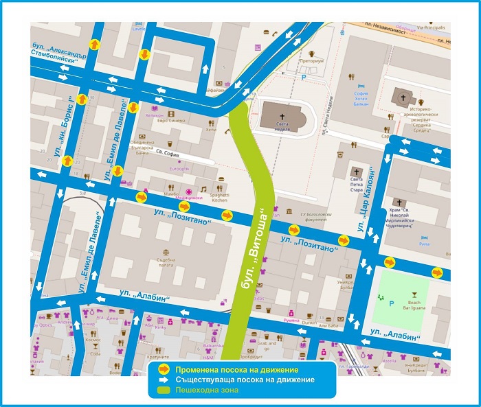 Променя се посоката на движение на автомобилите по три улици: "Позитано", "Лавале" и "Княз Борис Първи" (виж схемата).