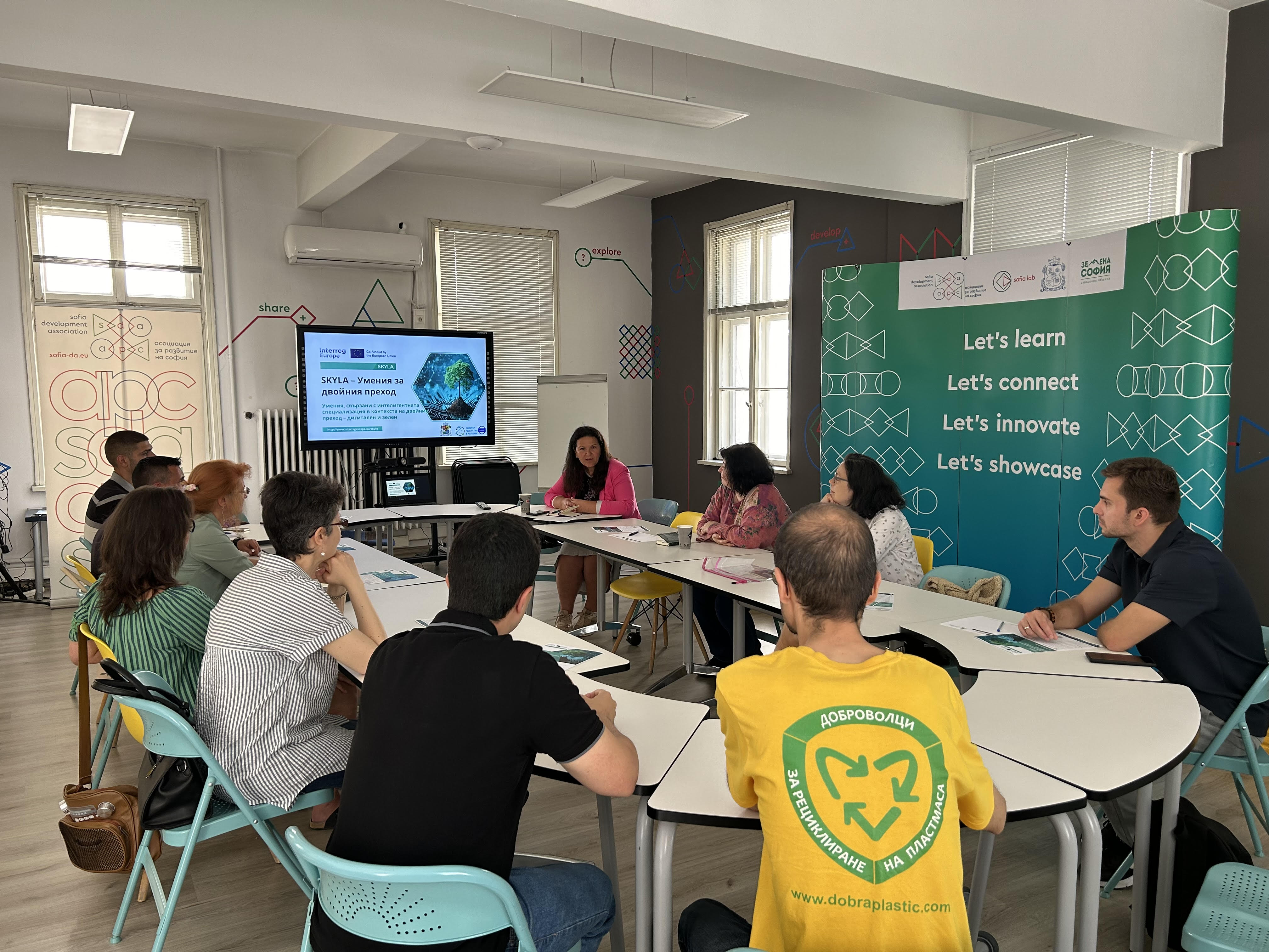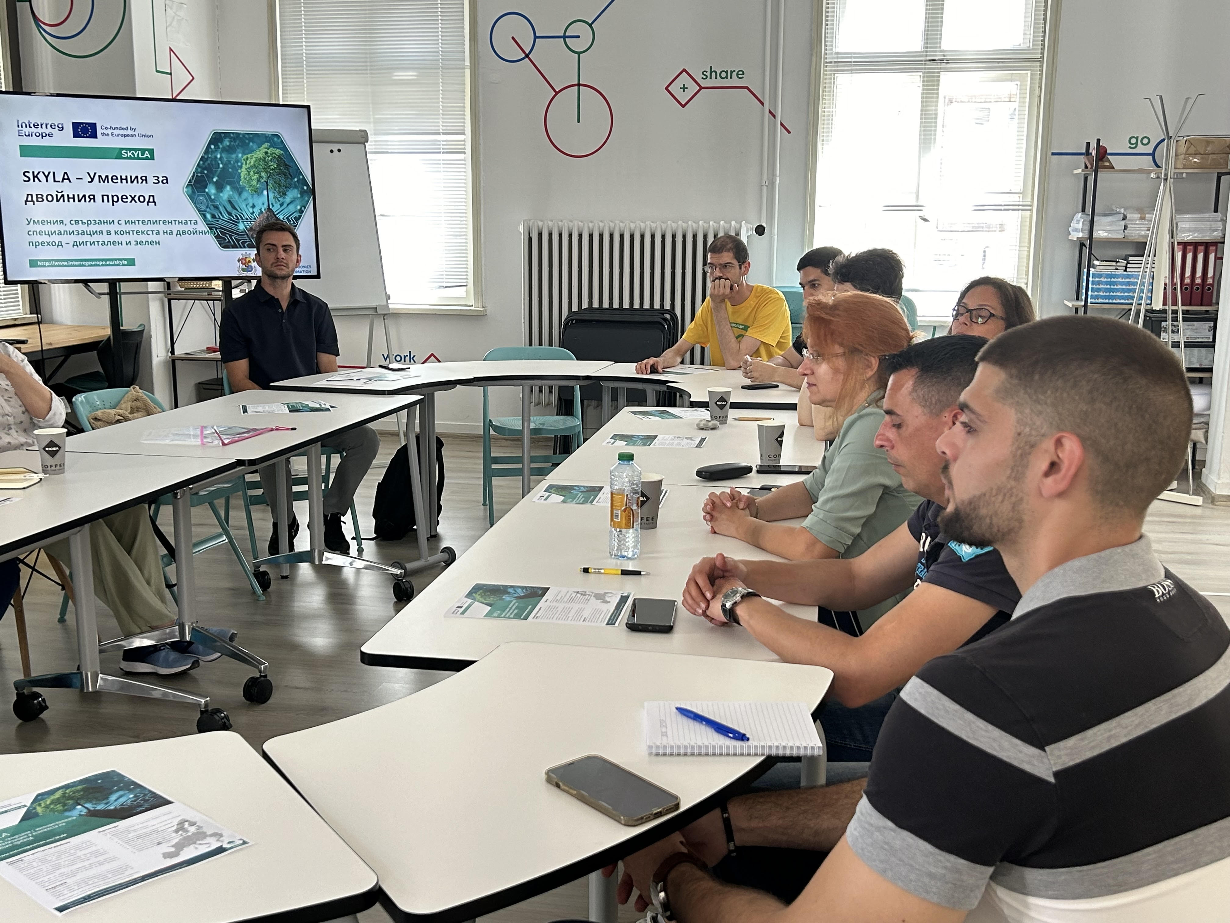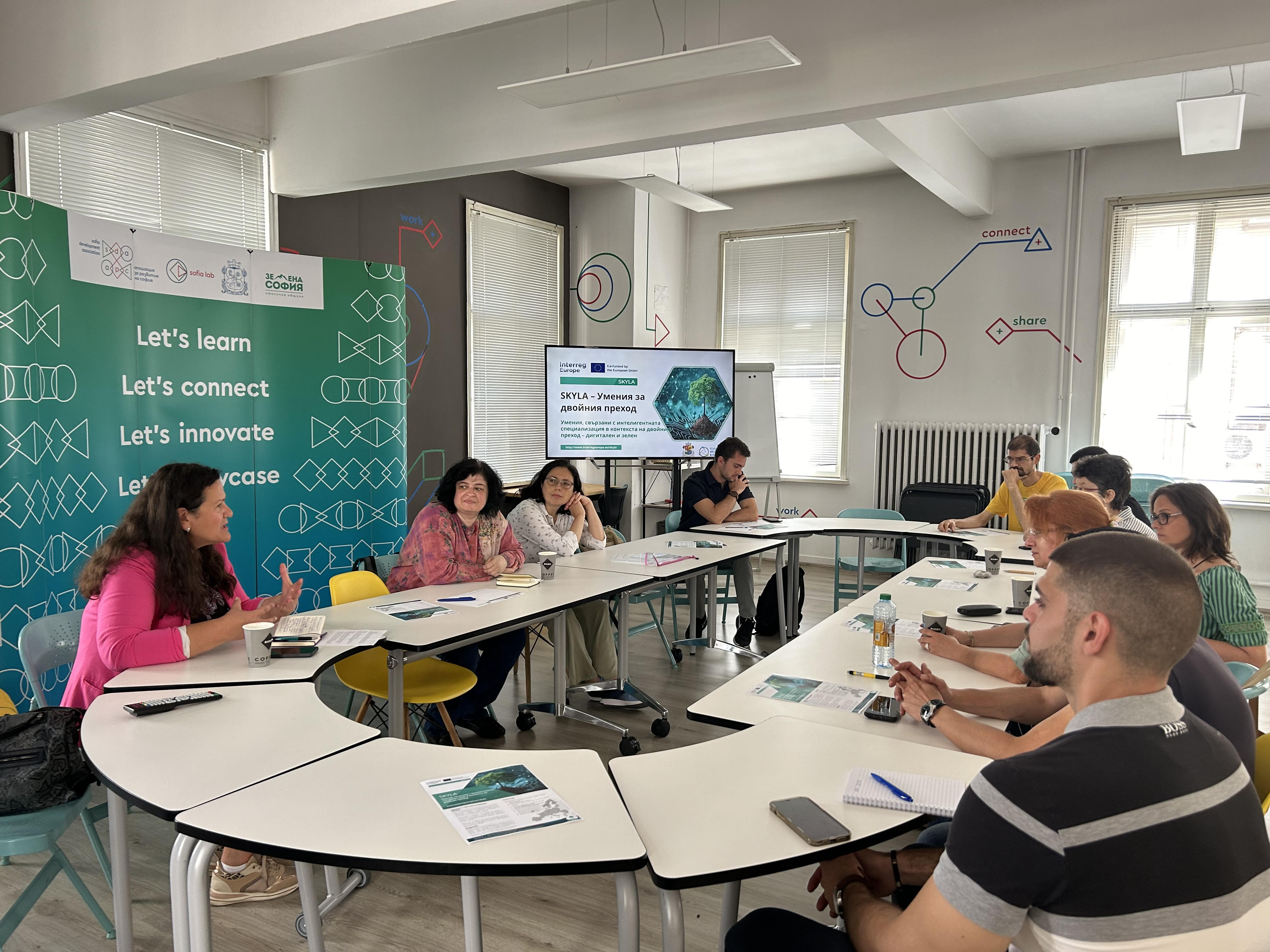 На 4 юли в Софийската лаборатория за иновации се проведе въвеждаща среща по проект „Умения, свързани с интелигентната специализация в контекста на двойния преход” (SKYLA - Smart Specialisation Skills Ecosystems for the Twin Transition), финансиран по Програма „Интеррег Европа” 2021 - 2027 на Европейския съюз.