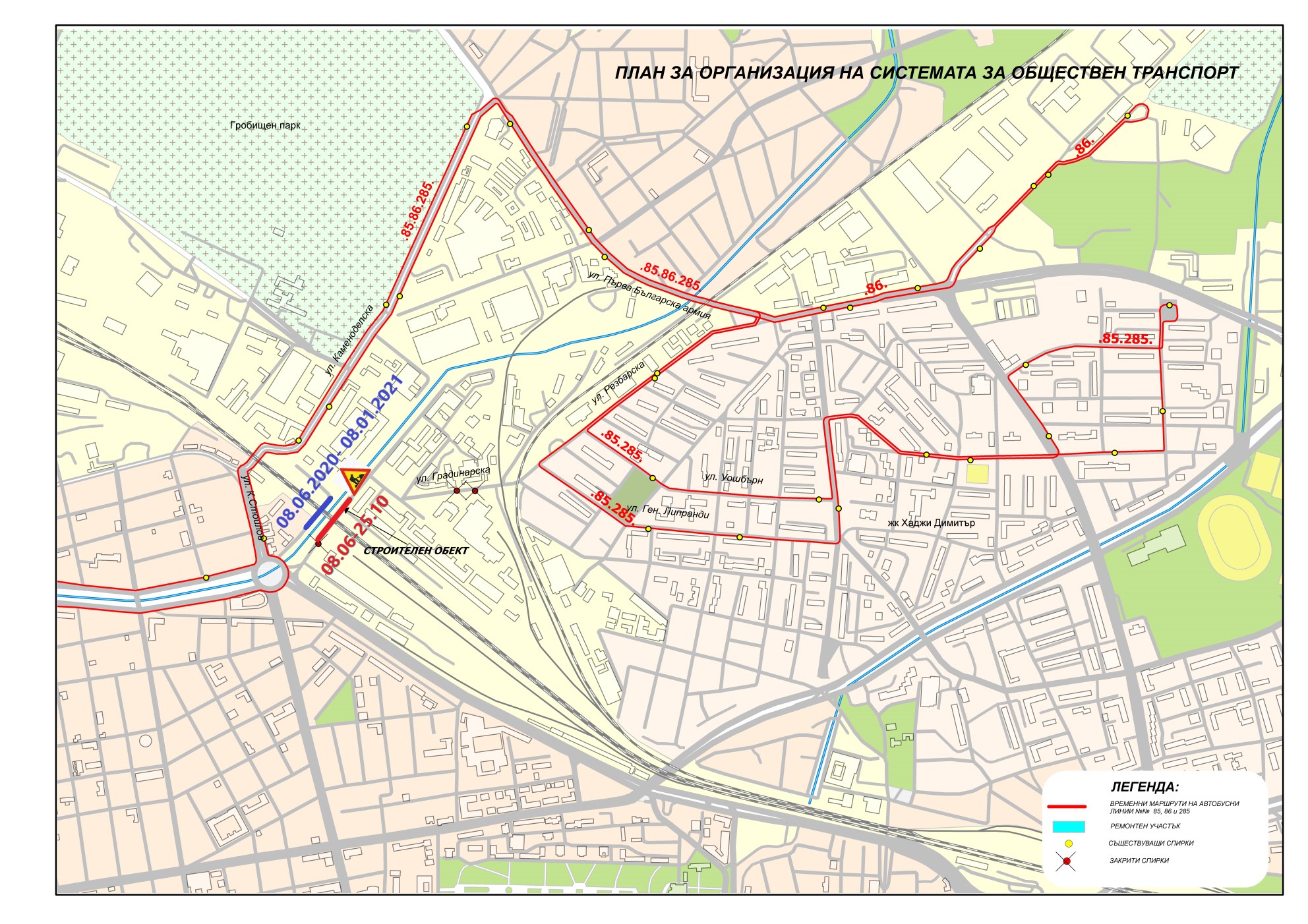 Промяната на маршрута на автобусна линия № 86 е в посока ж.к. „Свобода“ от АП Малашевци по маршрута до ул. „Резбарска“/ул. „Първа българска армия“, надясно по ул. „Първа българска армия“, наляво по ул. „Каменоделска“, наляво по ул. „Константин Стоилов“ и надясно по бул. „Сливница“ и по маршрута двупосочно.