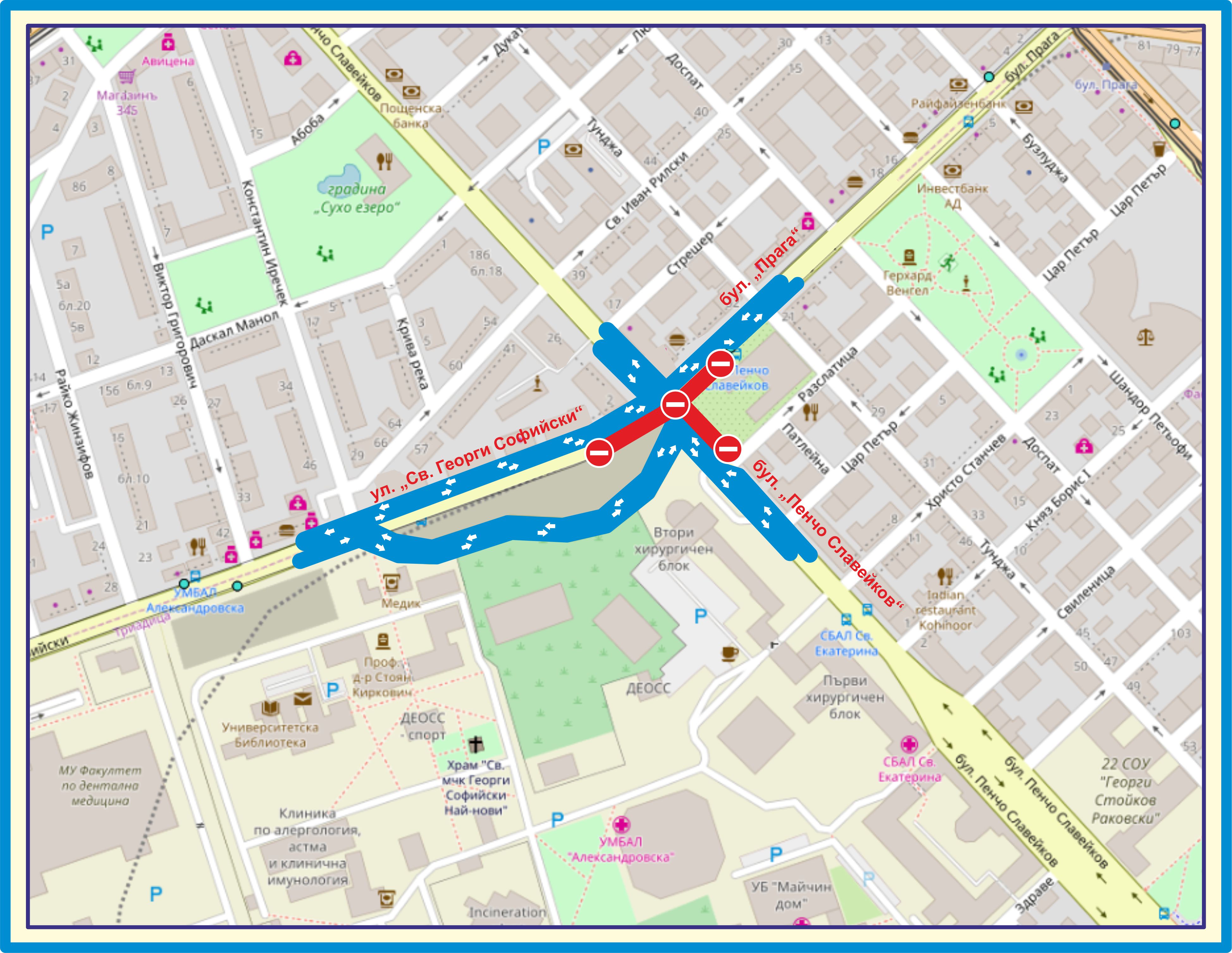 - по южната половина от пътното платно на ул. „Свети Георги Софийски“ в участък от около 50 м преди бул. „Пенчо Славейков“ и по южната половина от пътното платно на бул. „Прага“ в участък от около 20 м след бул. „Пенчо Славейков“. Движението ще се извършва двупосочно в една пътна лента по северната половина от пътното платно по ул. „Свети Георги Софийски“ и по бул. „Прага“ в същия участък;