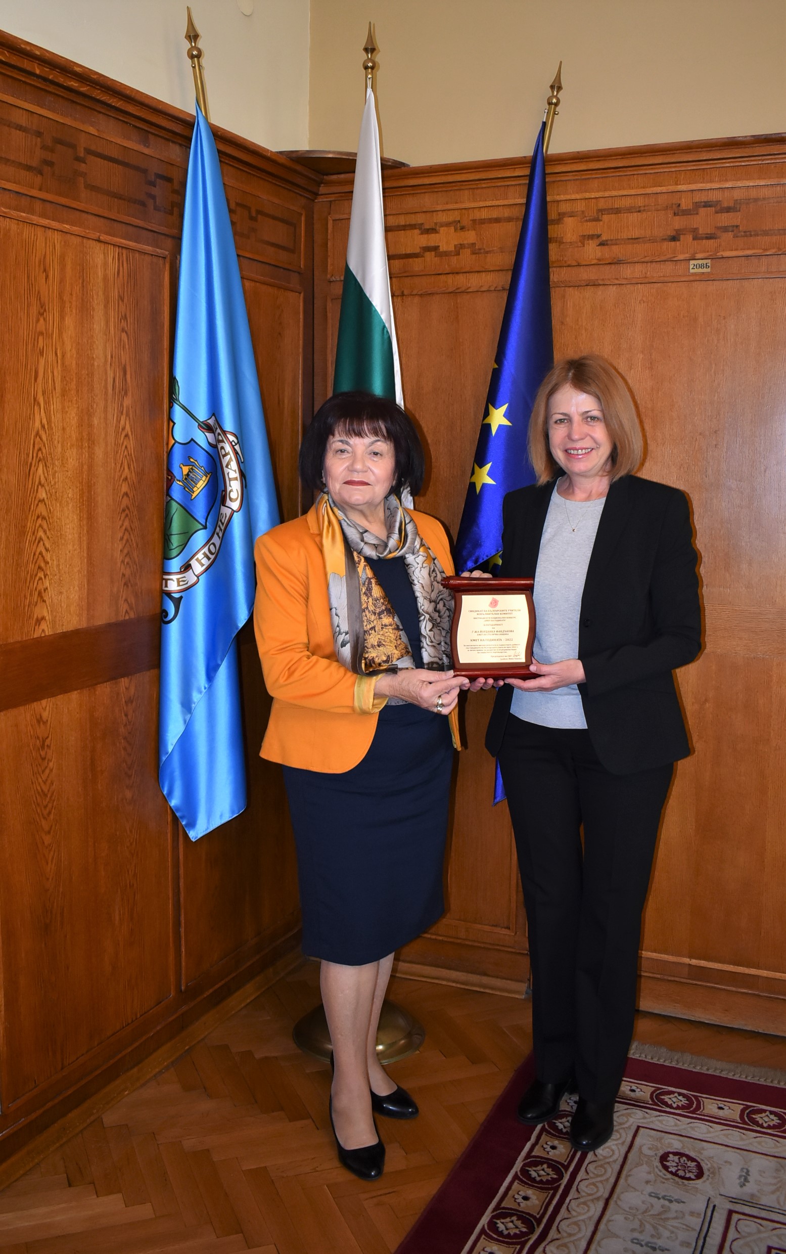 Кметът Фандъкова получи от председателя на СБУ цветя и почетен плакет за постигнати високи резултати в съвместната дейност със Синдиката на българските учители през 2022 г. за изключителни заслуги и личен принос за развитието и усъвършенстването на социалното партньорство и образователната система на столицата.
