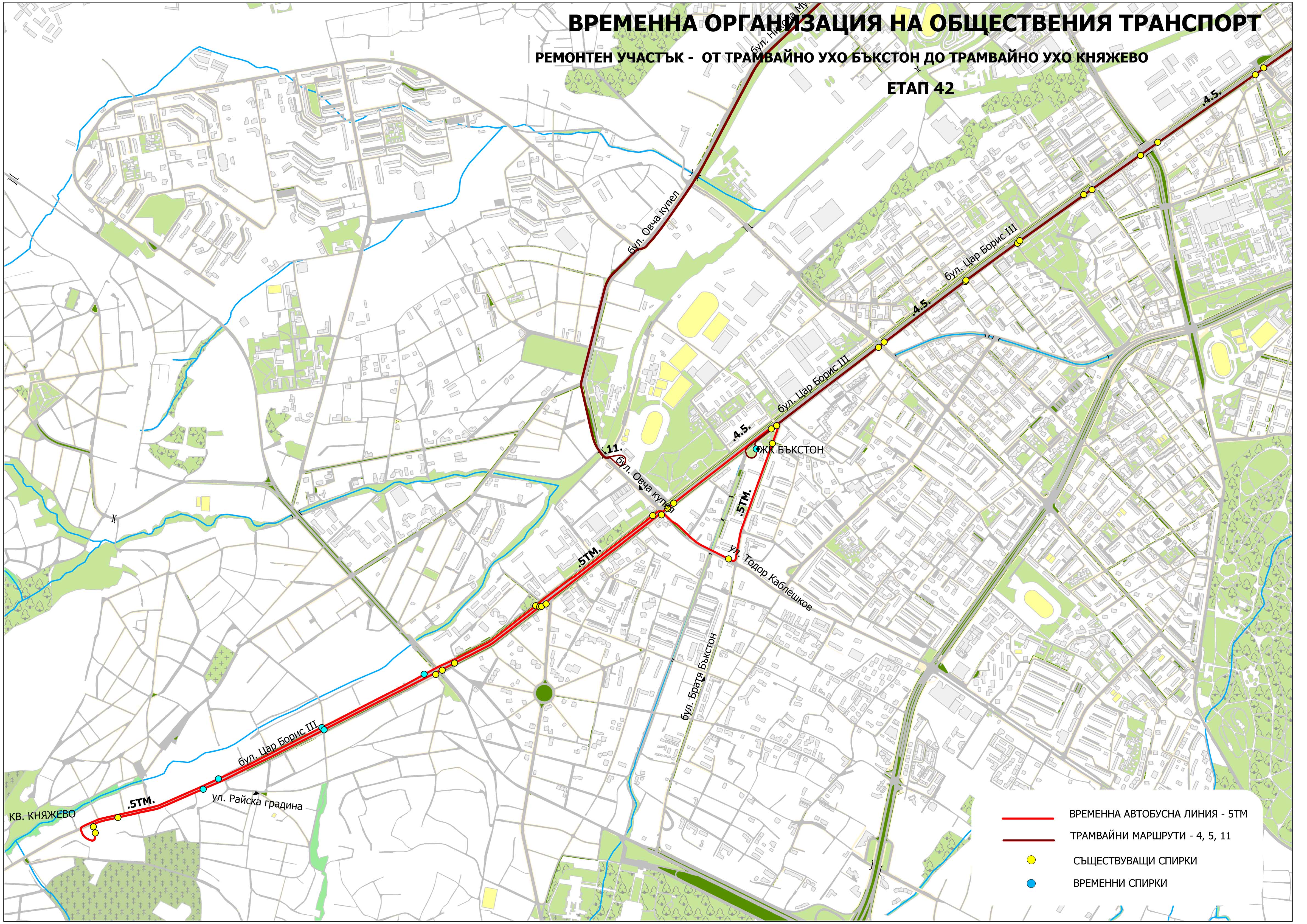 Осигурява се временна автобусна линия № 5ТМ – автобусите ще се движат по маршрут от автостанция „Княжево“ (крайна станция на автобусна линия № 58) по бул. „Цар Борис III“, по бул. „Братя Бъкстон“, по ул. „Тодор Каблешков“ и наляво по бул. „Цар Борис III“ по маршрута до автостанция „Княжево“.