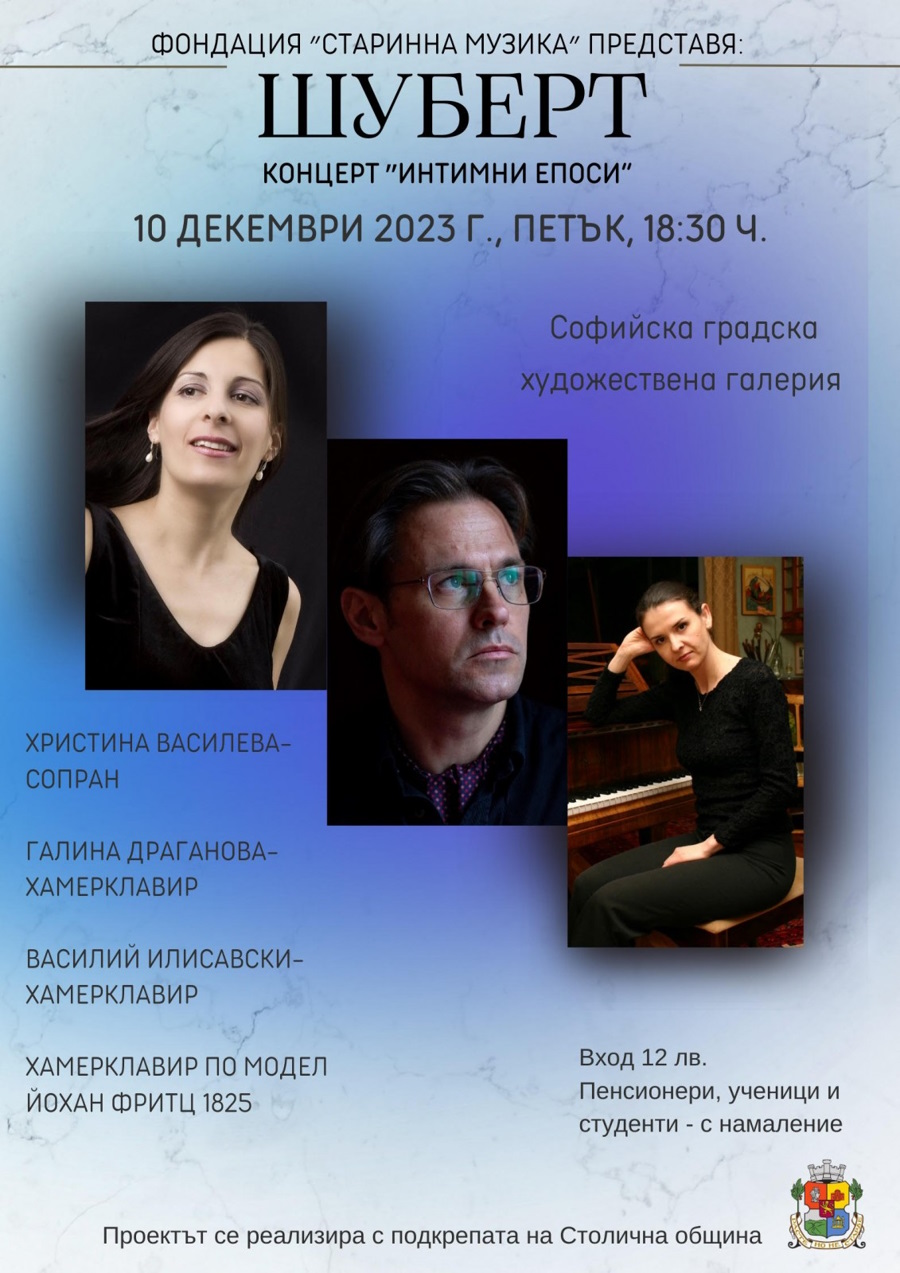 Концертът "Интимни епоси" представя исторически инструмент от епохата – Шубертов хамерклавир по модел Йохан Фриц от 1825 г. Концертът включва девет Шубертови песни, Унгарско дивертименто за четири ръце оп. 54, 1824 г., и Соната до минор D 958, 1828 г. Участват: Христина Василева (сопран), Галина Драганова и Василий Илисавски (хамерклавир).