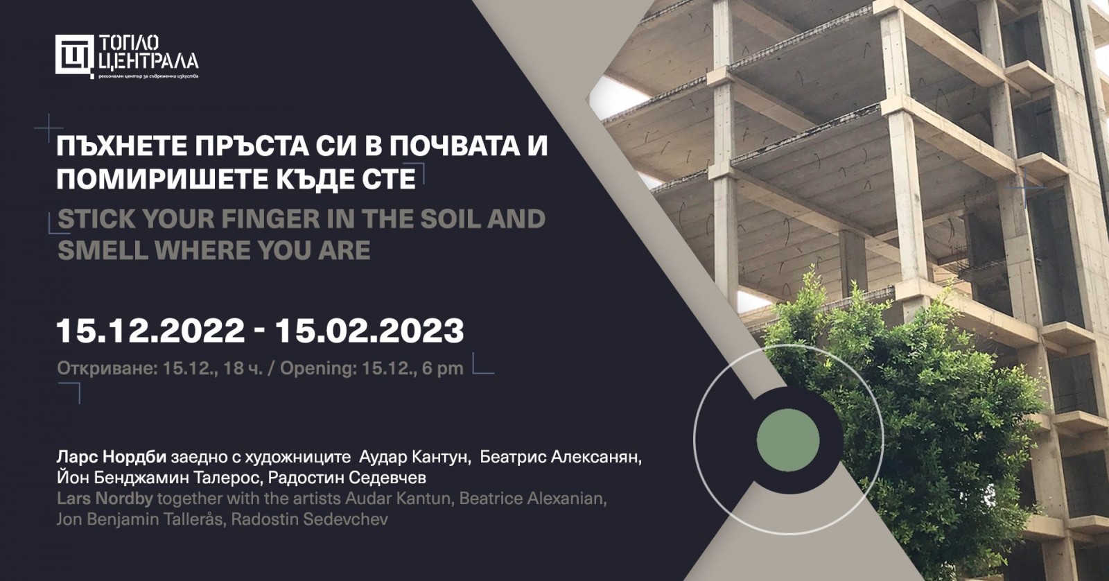В търсене на отговорите на екзистенциалните въпроси, които съществуват от зората на света, Нордби и художниците Радостин Седевчев, Беатрис Алексанян, Аудар Кантун и Йон Бенджамин Талерос започват да изграждат в “Пъхнете пръста си в почвата и помиришете къде сте” своята представа за човека от същинската начална точка на всеки един обект – скелето. Визуалните артисти са поканени да отговорят на това, което представлява скелето на реалността на тъканите и да включат фотография и цифрови изображения като разширен поглед към дефектите на анатомичните характеристики на човечеството.