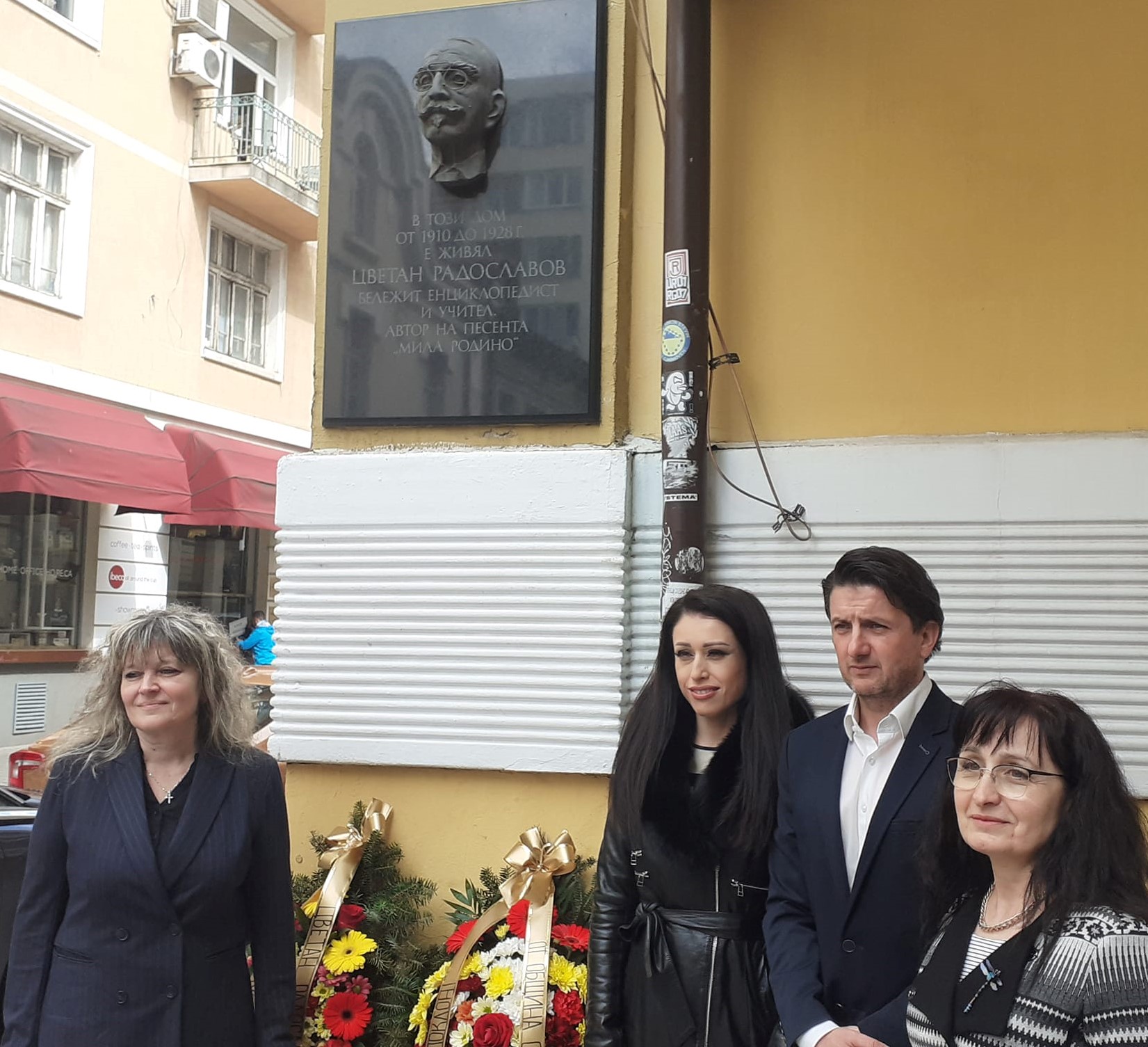 „Отбелязваме 160 години от рождението на Цветан Радославов, автор на националния ни химн. Блестящ ум, отказал преподавателска кариера в Европа, където завършва образованието си, за да се завърне в България и да обучава младите българи в западни и древни езици, психология, етика и логика. Голям учен и скромен човек, чието дело трябва да бъде по-добре изучавано днес“ – каза заместник-кметът на София Мирослав Боршош на церемония по поднасяне на венци и цветя пред барелефа на Цветан Радославов. Възпоменателната плоча е разположена на сградата на ул. „Ангел Кънчев“ № 3, където Радославов е живял в малка мансарда.
