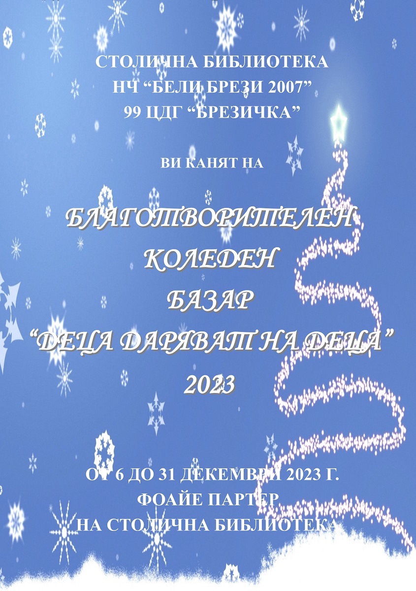 След представлението с кратка литературно-музикална програма в Мраморното фоайе на библиотеката ще бъде официално открит Коледният благотворителен базар „Деца даряват на деца 2023". Базарът е отворен за посетители от 6 до 31 декември т.г.