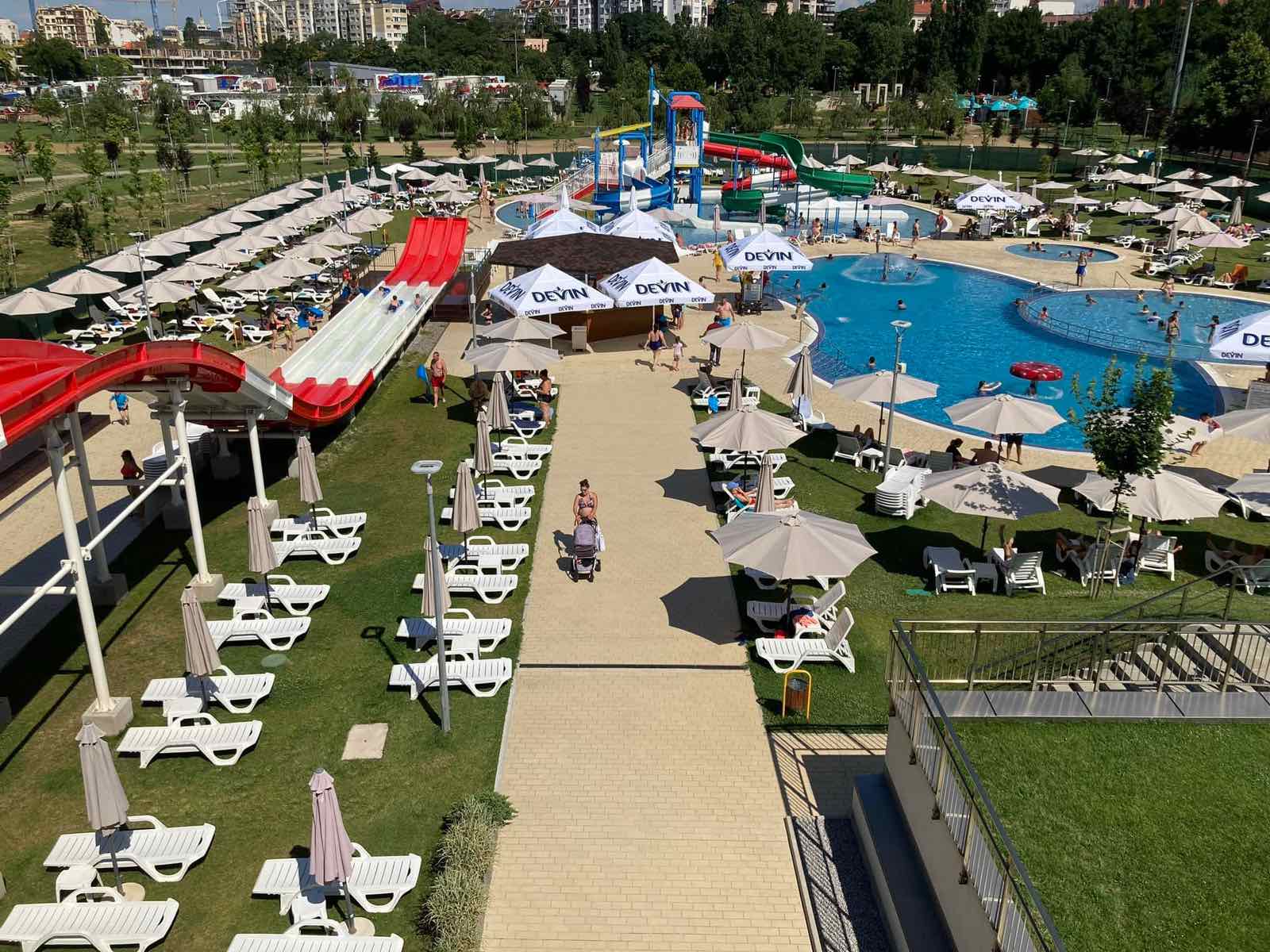 Обектът е разположен върху 6 700 кв. м и разполага с 5 открити басейна и 3 водни пързалки: