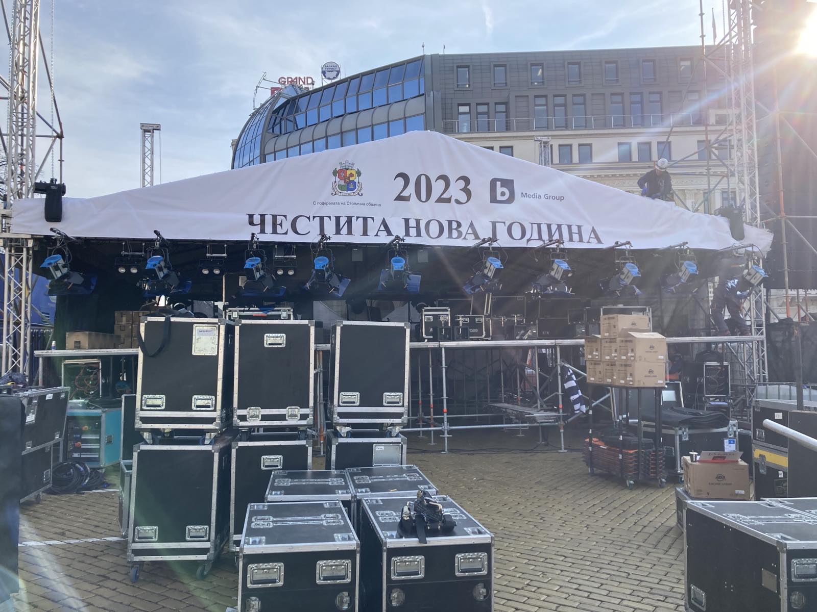 На 31 декември Новогодишният празничен концерт „Сцена под звездите“ ще започне в 20 ч. Вече тече усилена подготовка за сцената на площад „Княз Александър I“.