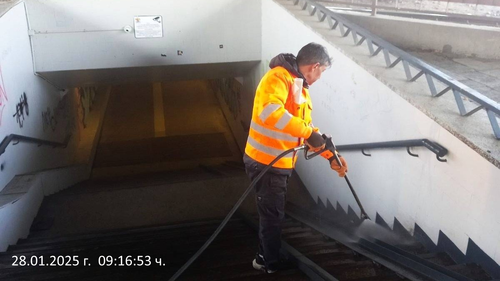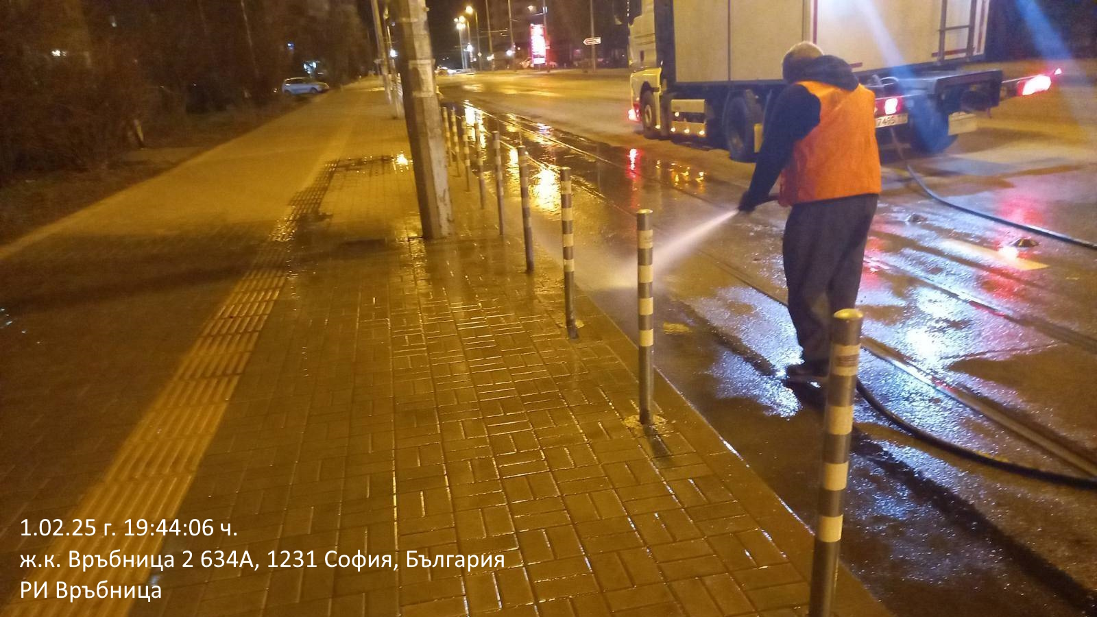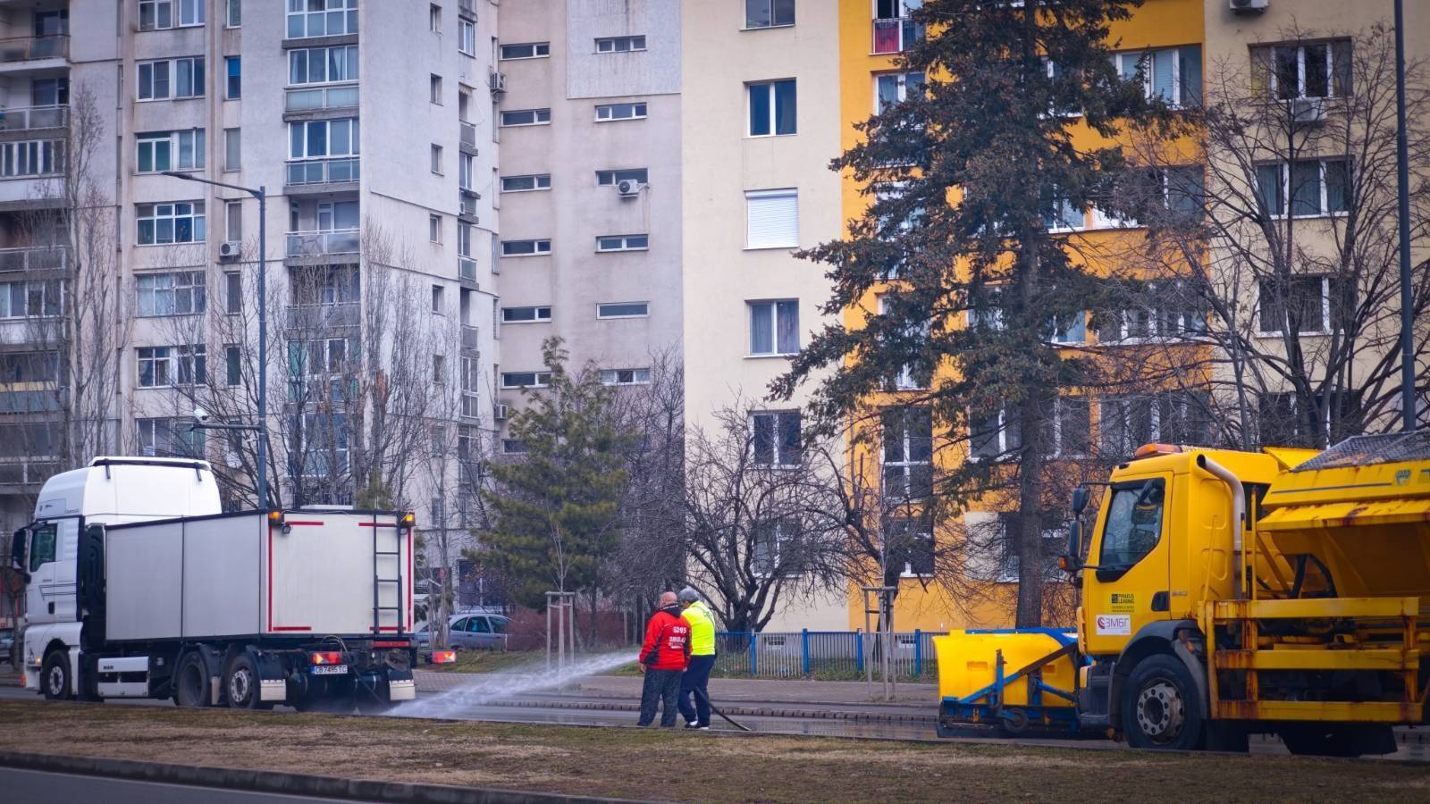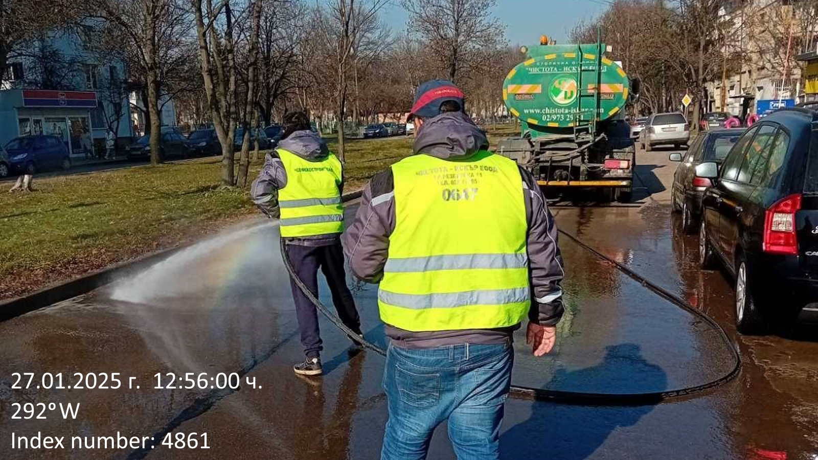 Благоприятните атмосферни условия с положителни температури през януари позволиха нощно миене с автоцистерна. Това е единствената възможност да бъдат добре почистени ключовите булеварди, по които натовареният трафик и движението на автомобилите с по-висока скорост не позволяват миене през деня.