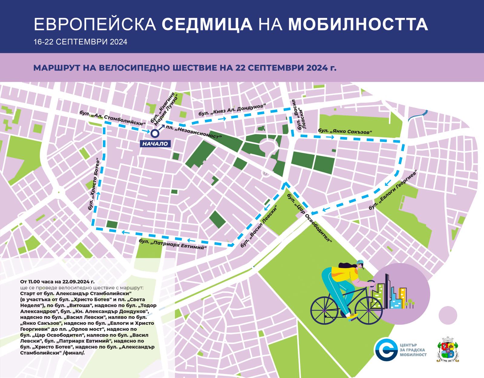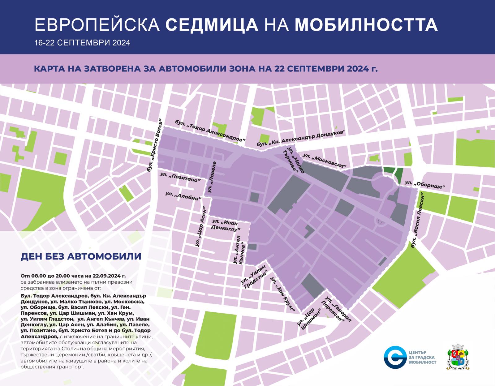 Традиционно, последният ден на Европейската седмица на мобилността е 22 септември, когато ще се отбележи и Европейският ден без автомобили. Пешеходни стават всички улици, заключени между булевардите “Васил Левски”, “Цар Освободител”, “Тодор Александров”, “Христо Ботев” и улиците “Алабин” и “Граф Игнатиев”.
